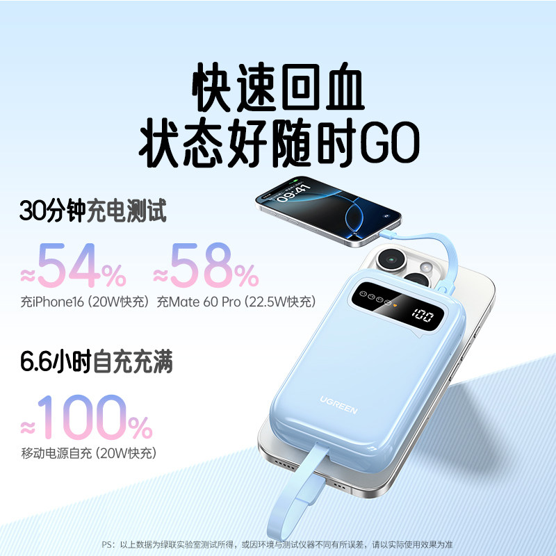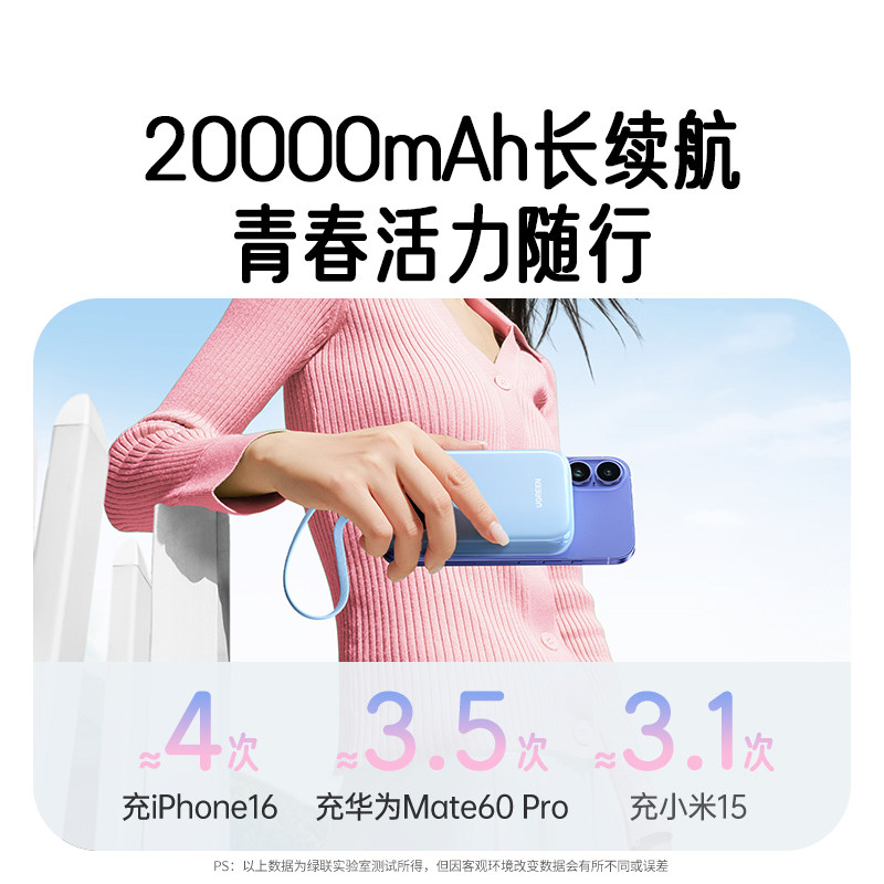 【充电宝3C认证可上飞机】绿联2026新款便携自带线充电宝20000毫安移动电源快充适用苹果17小米正品官方旗舰