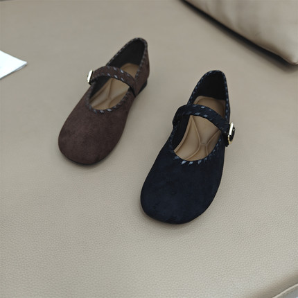 韩版平底圆头浅口单鞋2025新款复古时尚绒面一字带搭扣玛丽珍女鞋