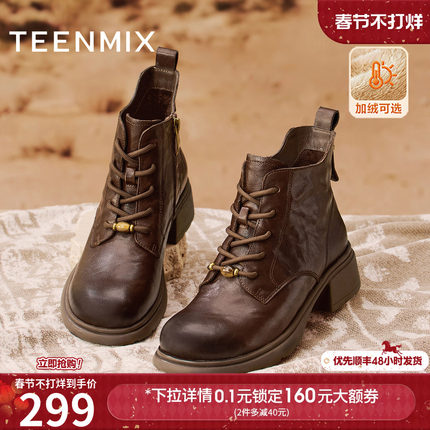 天美意复古厚底英伦马丁靴女鞋子加绒短靴皮靴2025冬新款KDX23DD5
