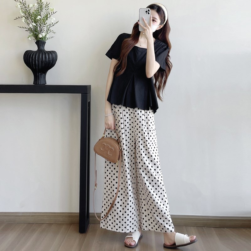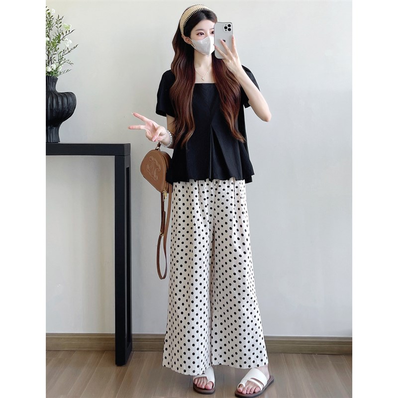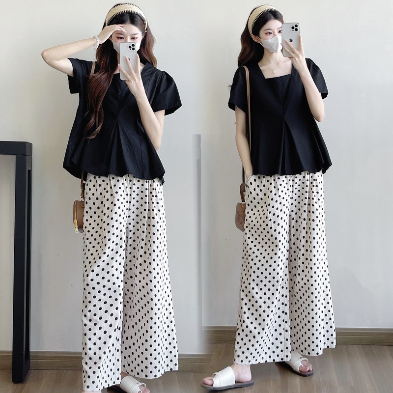 孕妇套装夏季2025新款黑u色宽松显瘦方领时尚短袖上衣阔腿裤两件