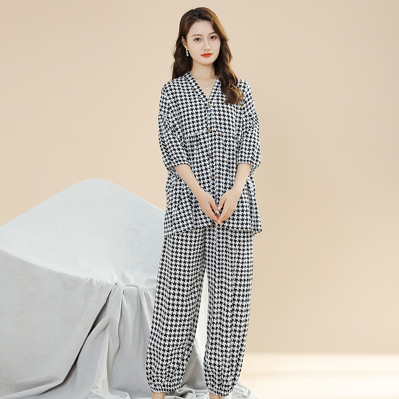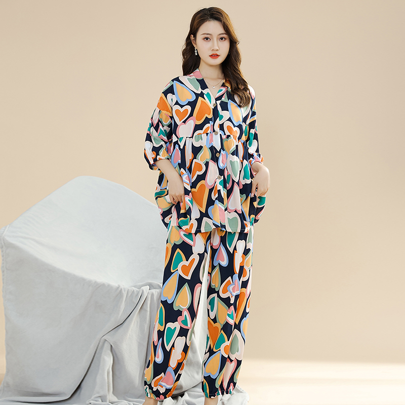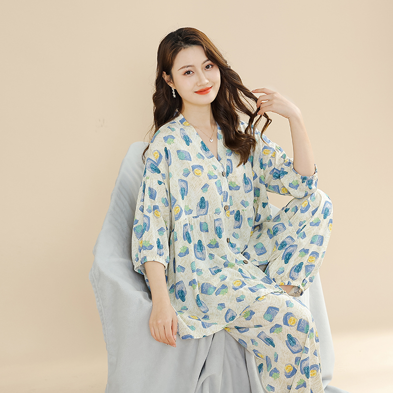 夏季绵绸睡衣女士长袖薄款纯棉绸套装韩版人造棉宽松家居服大码