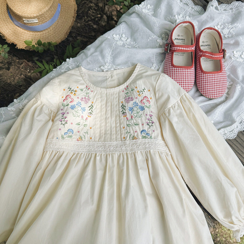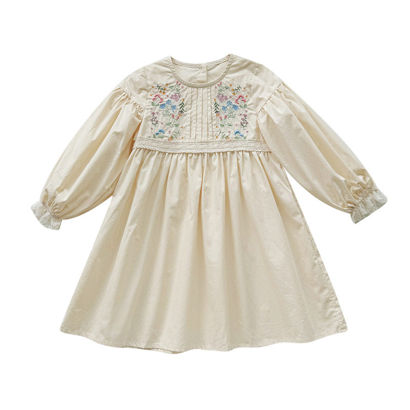 纯棉刺绣长袖公主裙蕾丝花边裙子