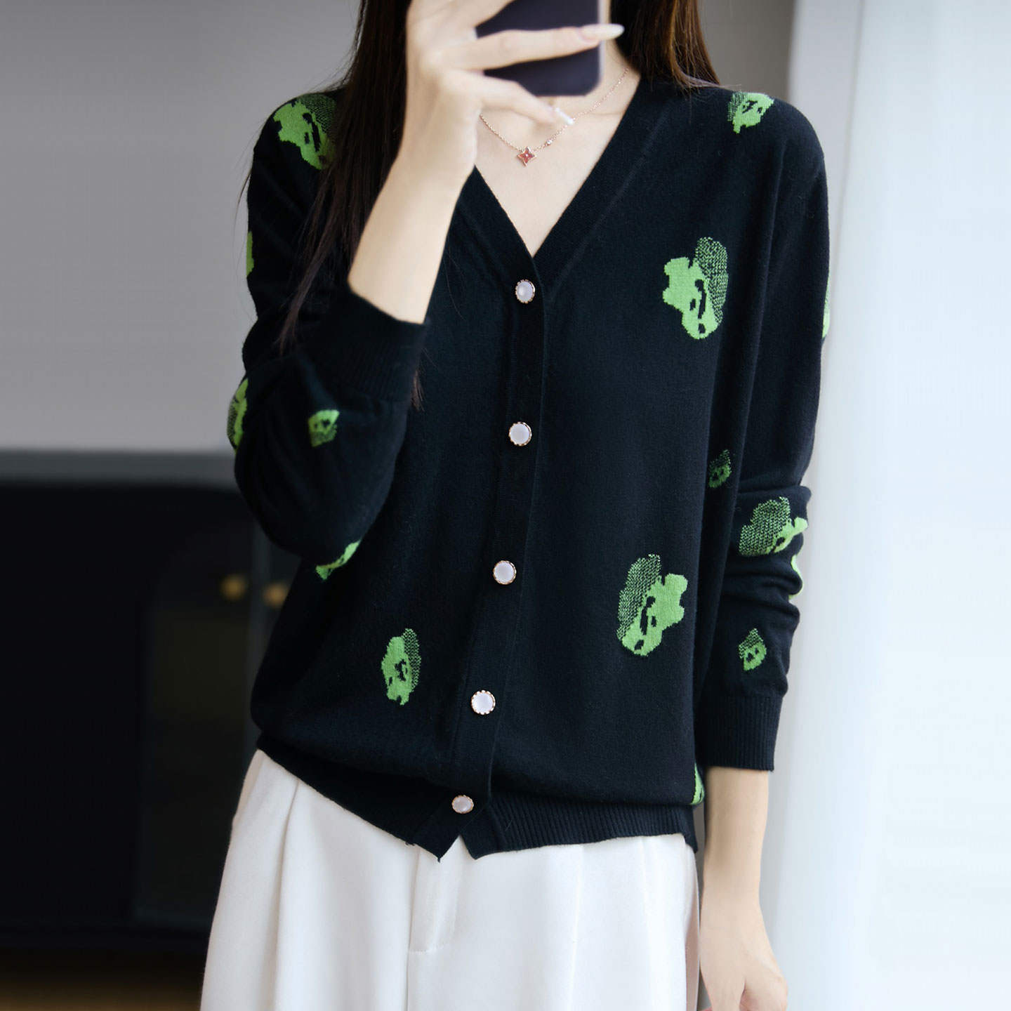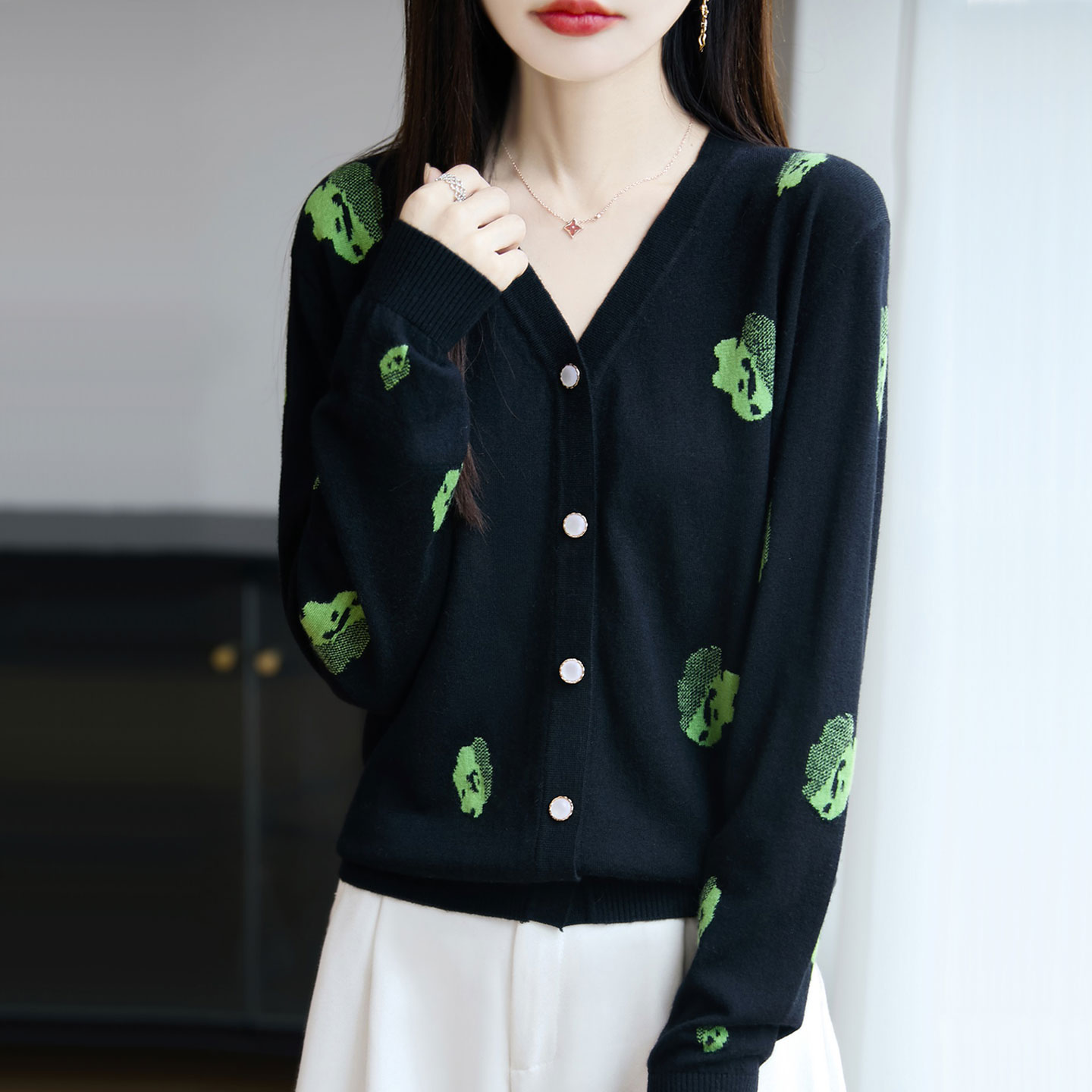 V领提花羊毛针织开衫外套女