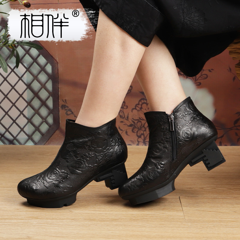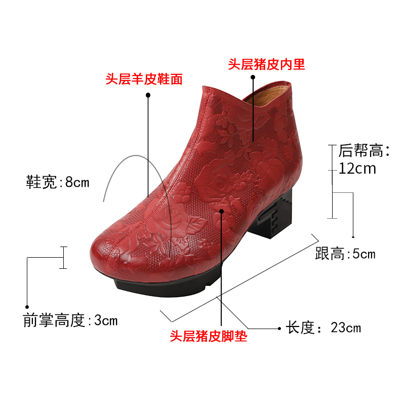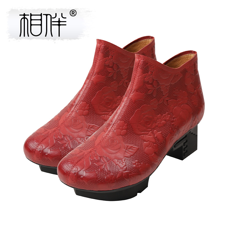 相伴真皮短靴女新款2025秋冬新款复古女靴民族风红色原创春秋单靴