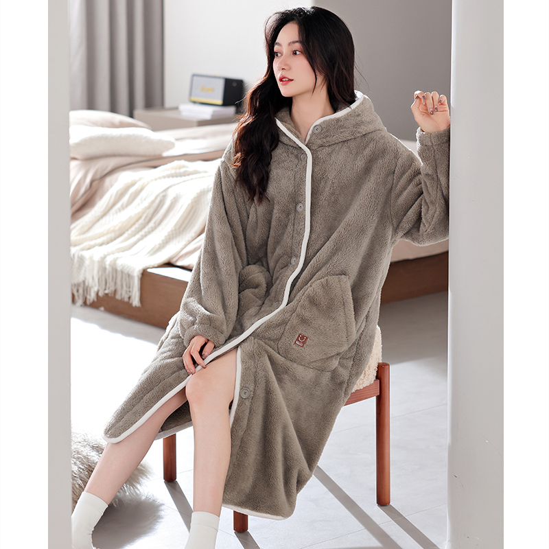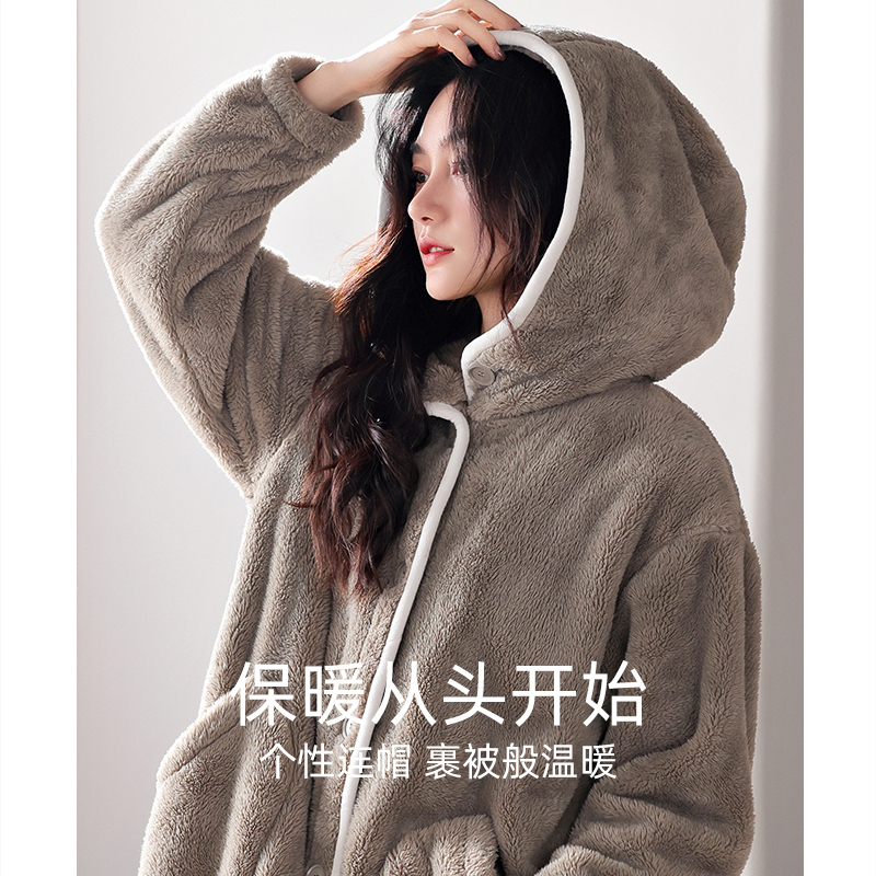 睡袍女冬季珊瑚绒加厚加绒浴袍睡衣女款秋冬法兰绒可外穿长款浴衣