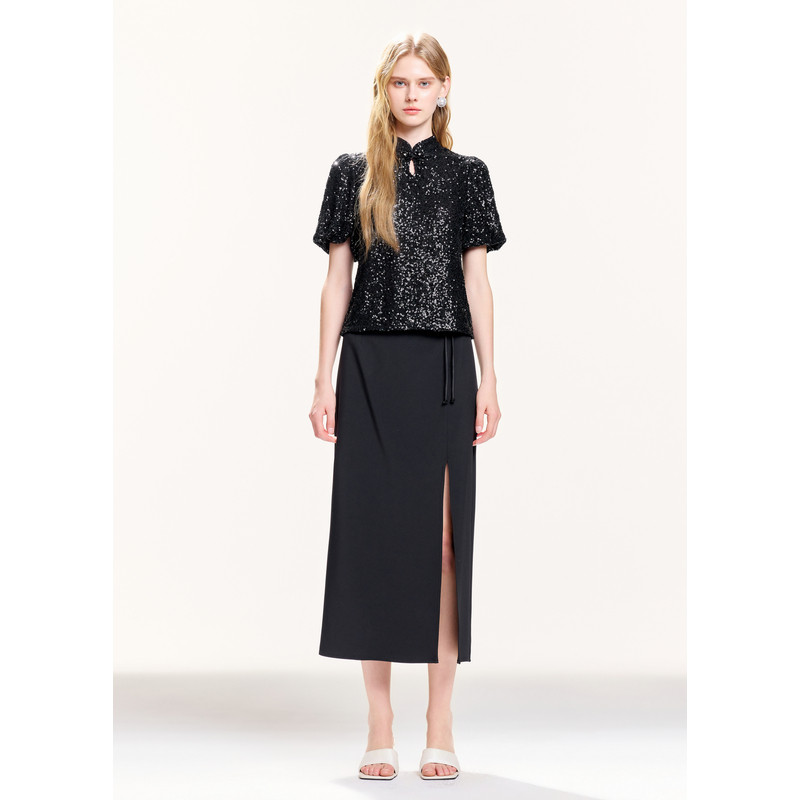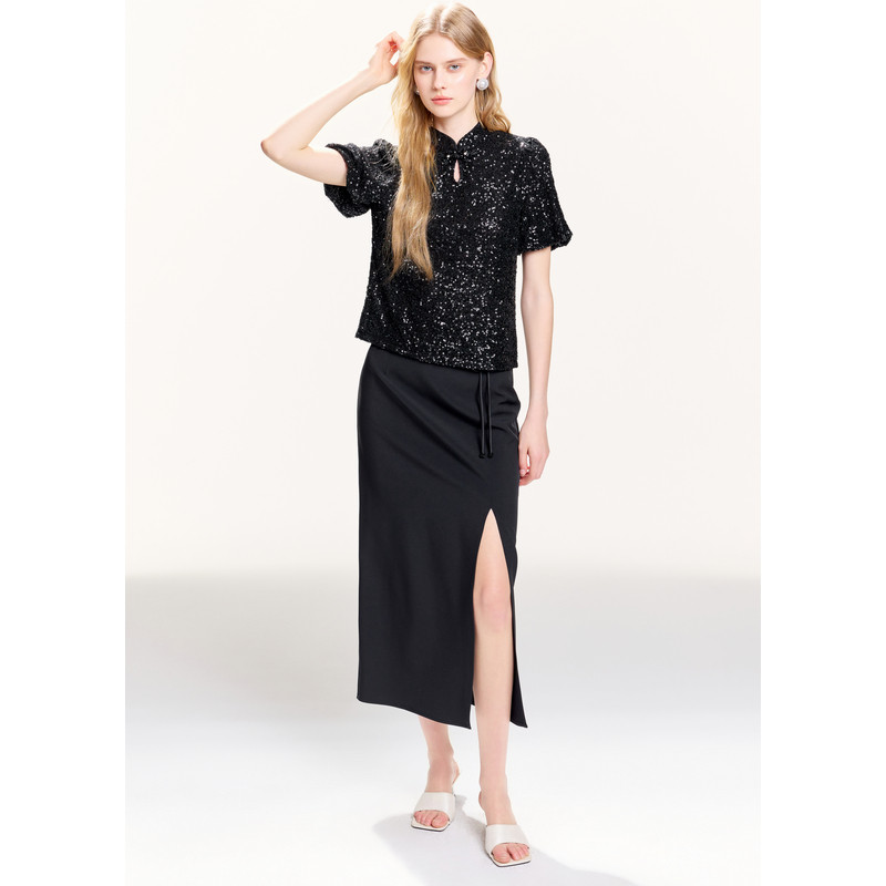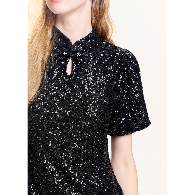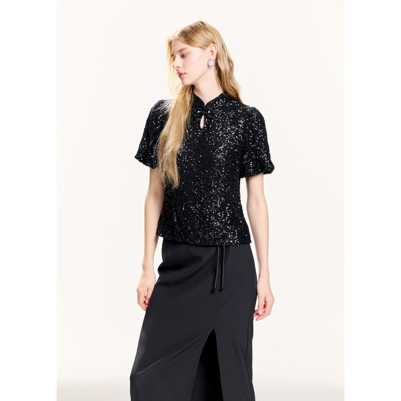 MISSCOCOON新中式盘扣亮片泡泡袖雪纺衫百搭黑色上衣秋款