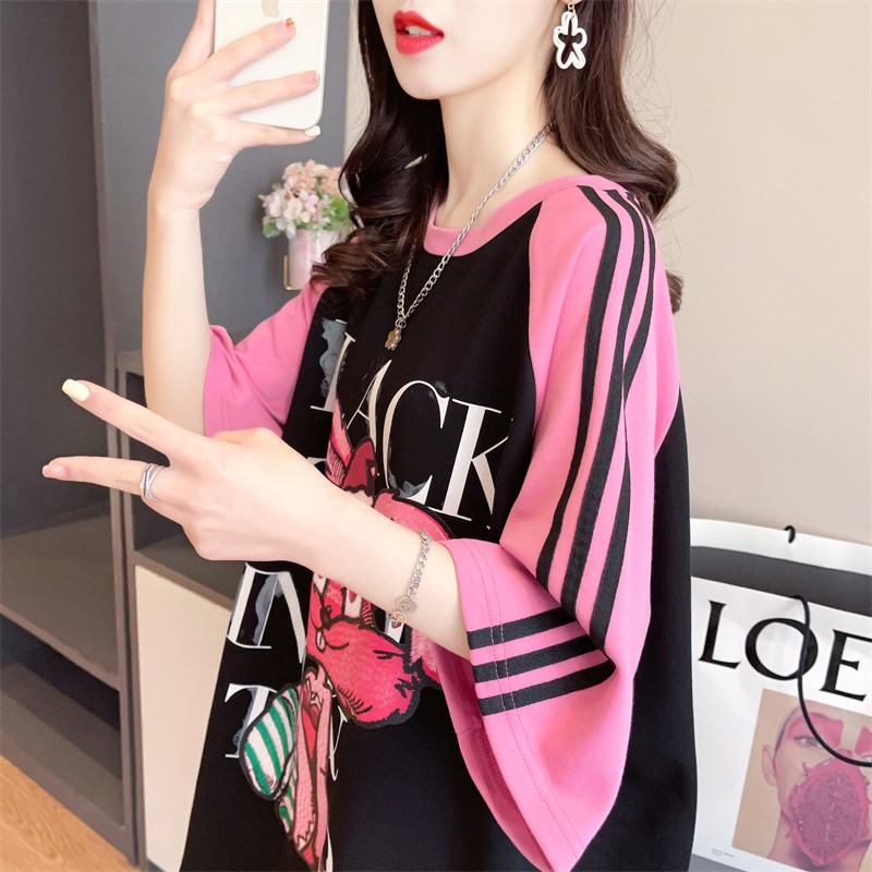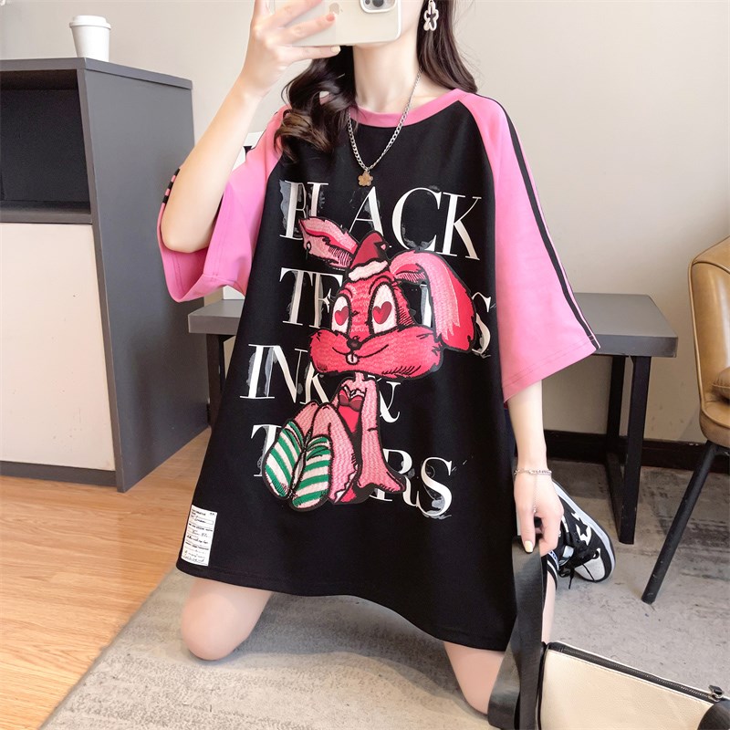 速发小众设计感t恤夏装韩版宽松大码中长款撞色涂鸦半袖上衣服