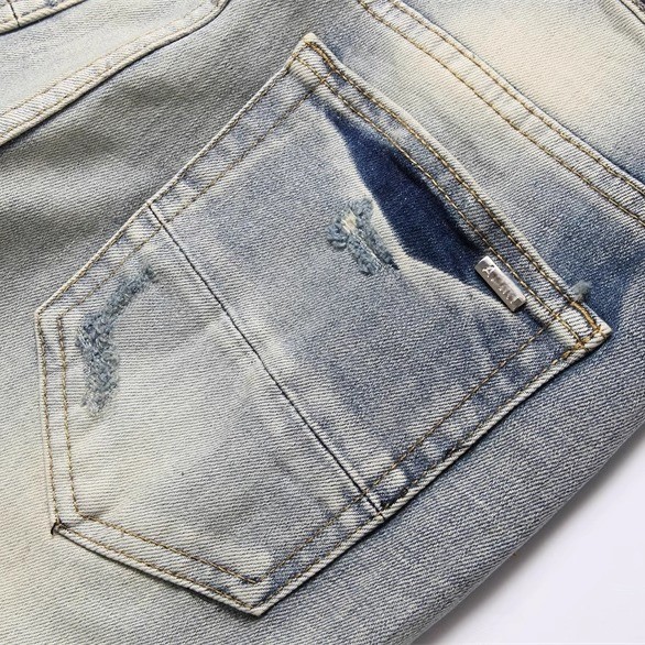 高端痞帅破洞补丁复古牛仔裤男春秋季潮牌刺绣修身小脚休闲百搭裤