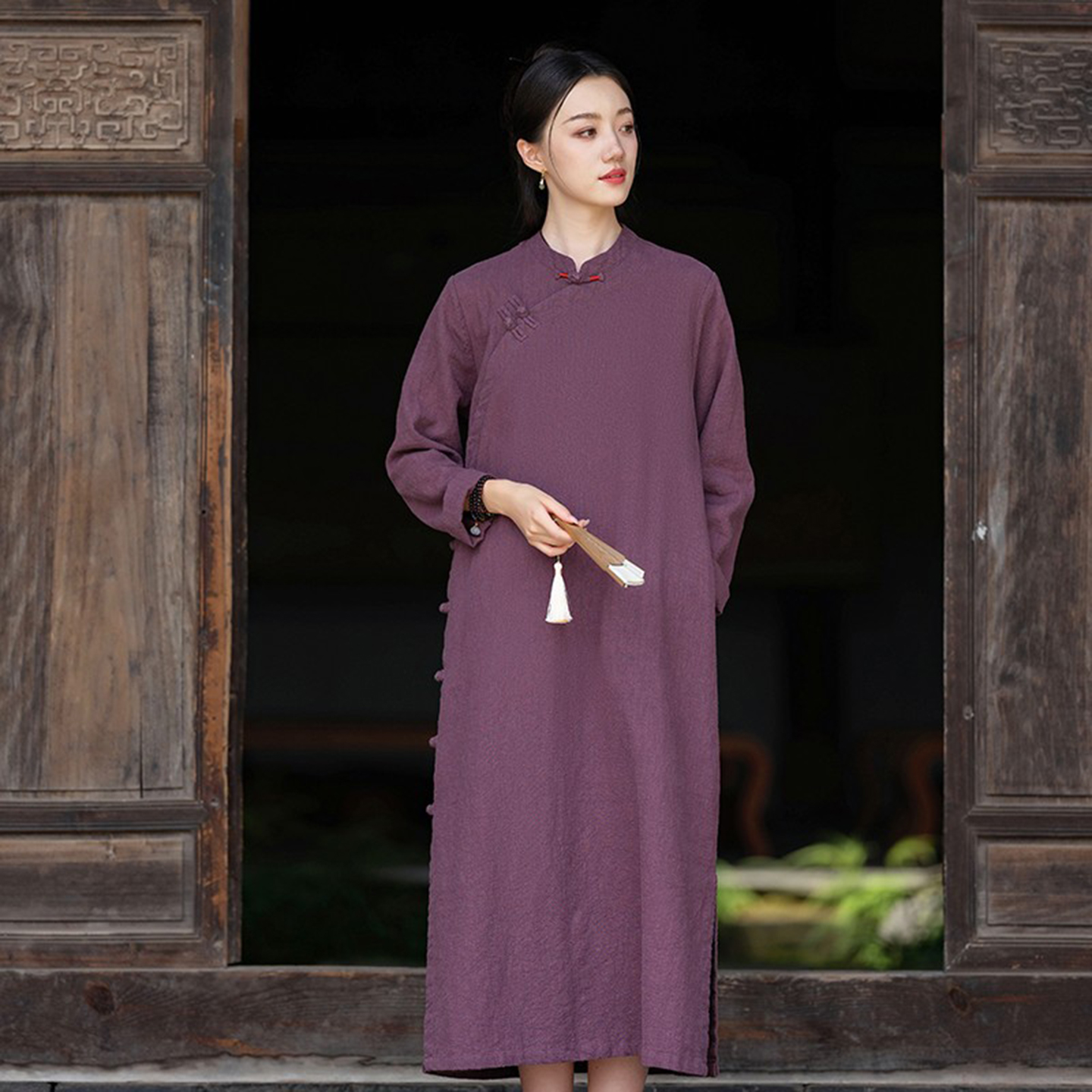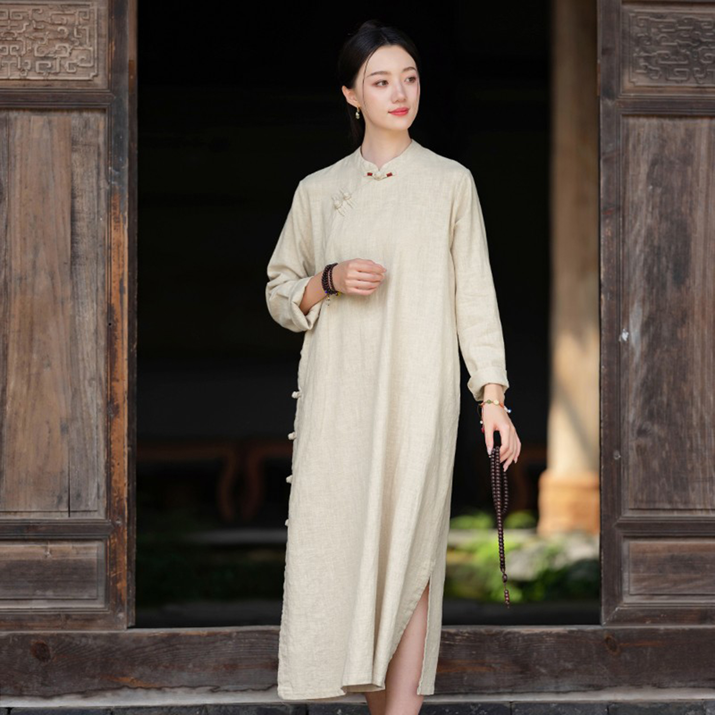 新中式棉麻连衣裙秋季新款复古国风禅意长裙子斜襟盘扣改良旗袍裙