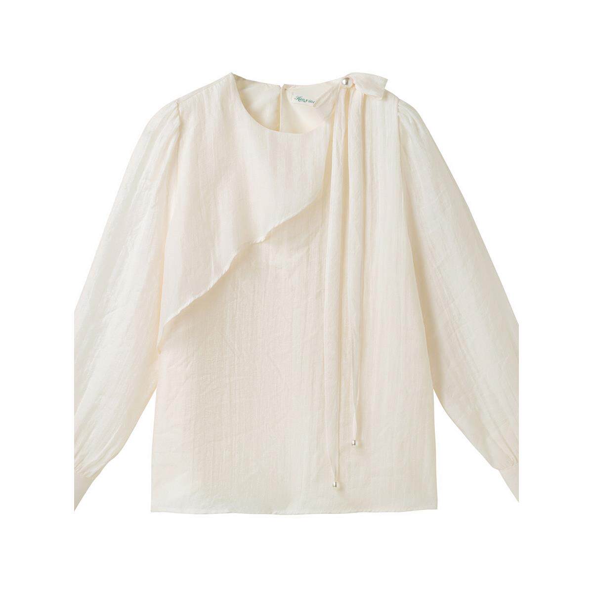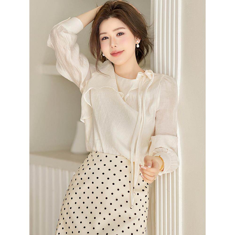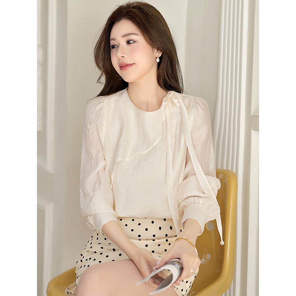 法式温柔杏色真丝长袖衬衫女春季圆领荷叶边系带优雅气质显瘦上衣