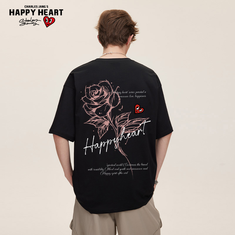 查尔斯桃心 美式手绘玫瑰印花短袖t恤男夏季新款纯棉圆领落肩上衣