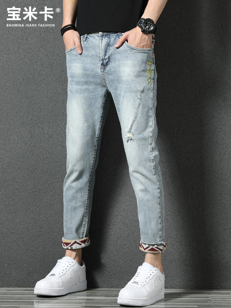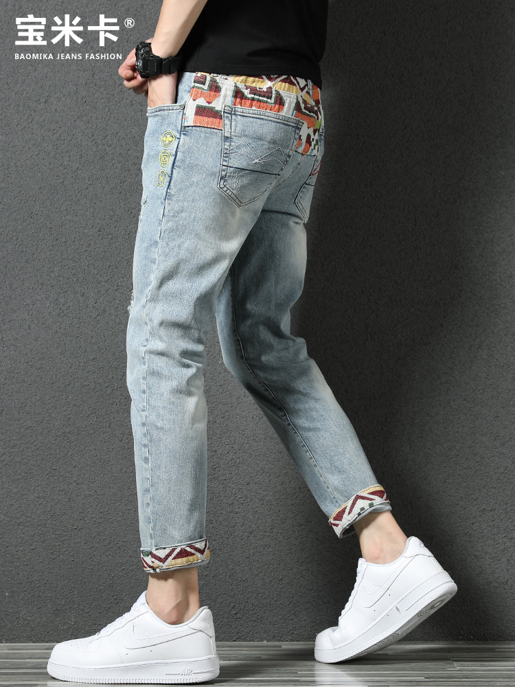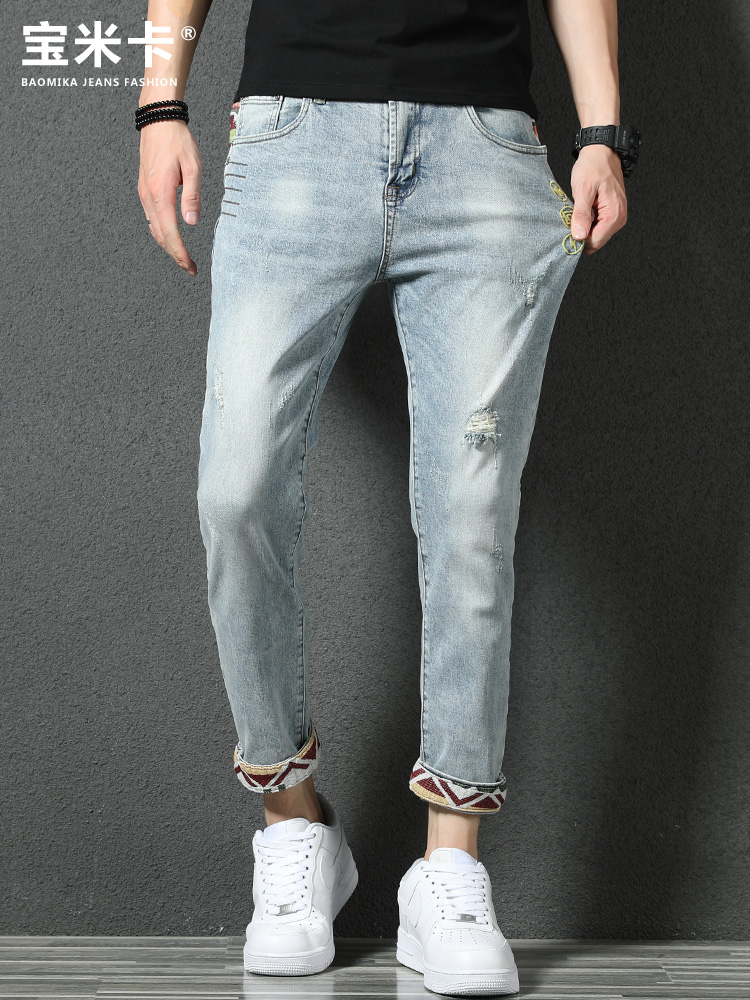 刺绣拼接破洞卷边春夏男九分裤新款修身9分休闲牛仔裤痞帅男裤子