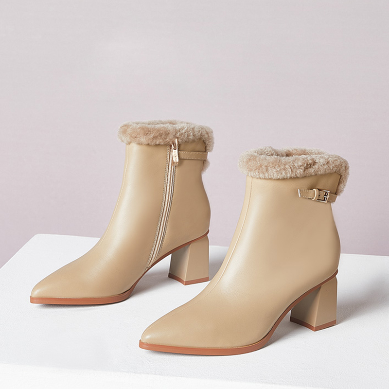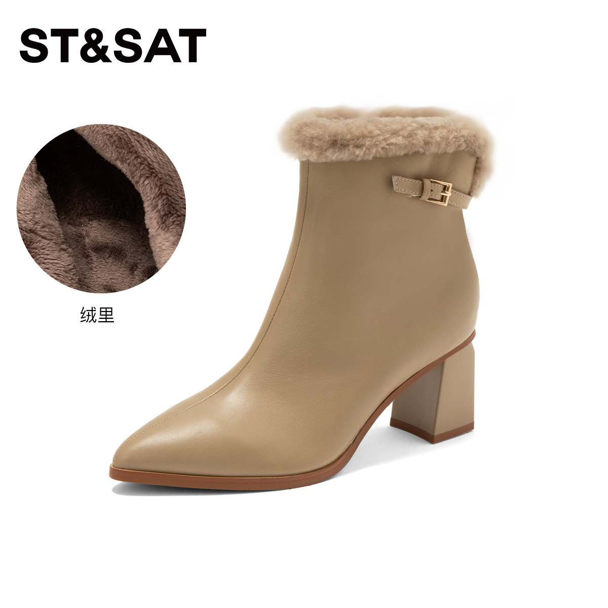 St&Sat/星期六秋冬羊皮尖头时装靴保暖绒里粗跟短靴女SS1411A802