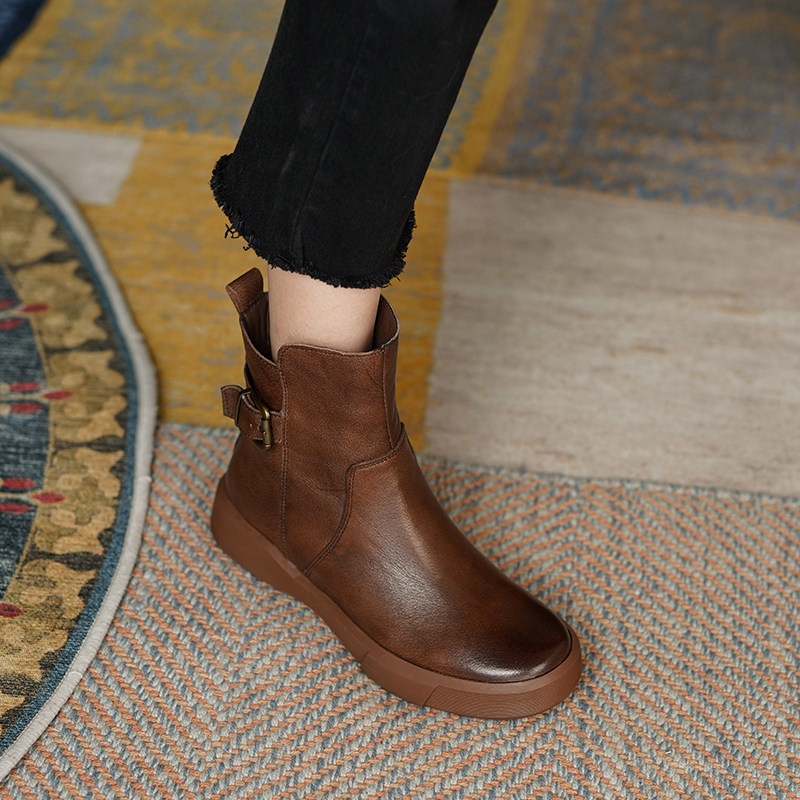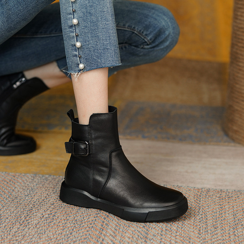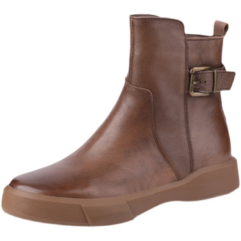 真皮圆头平底短靴复古2025年秋季新款英伦侧拉链马丁靴女大码单靴