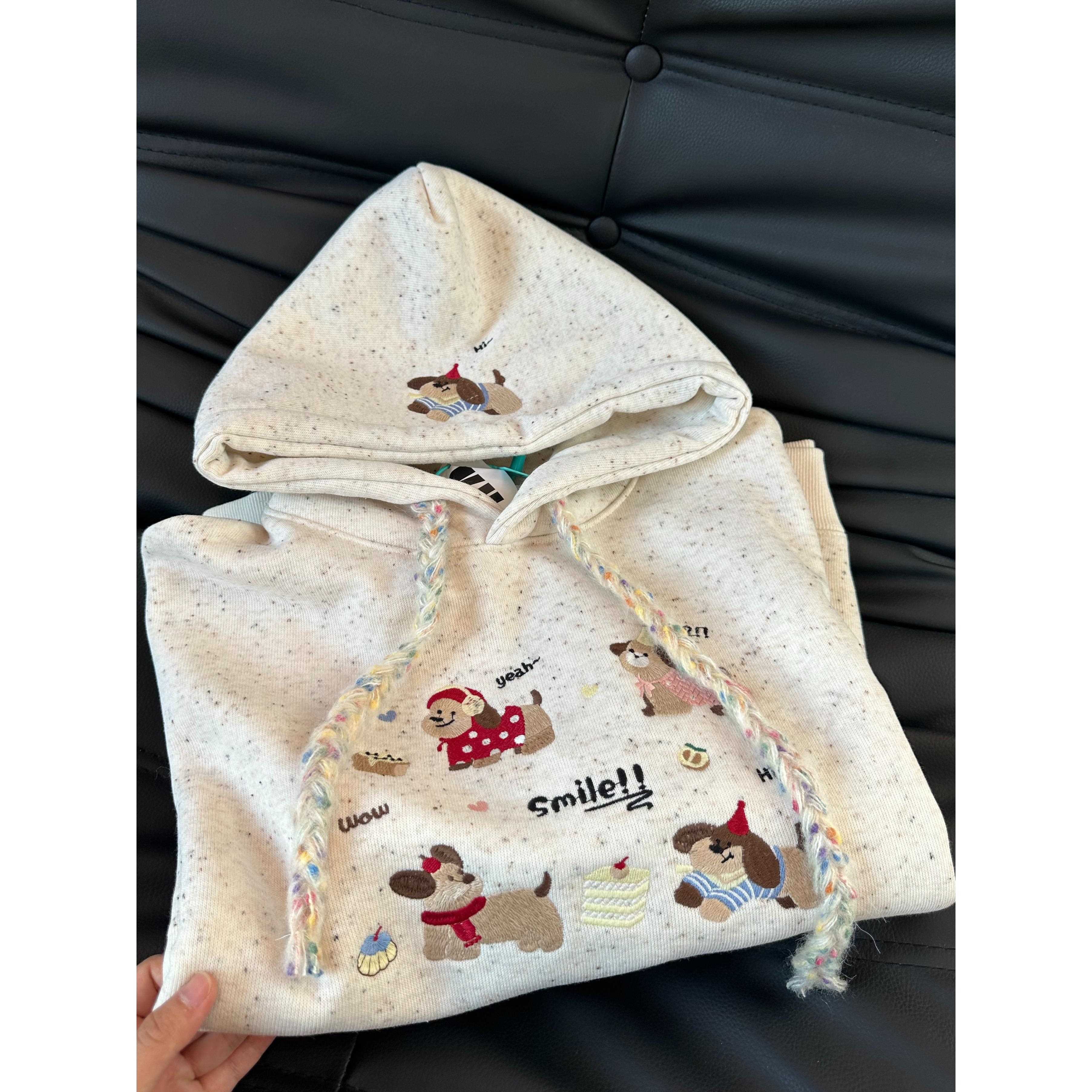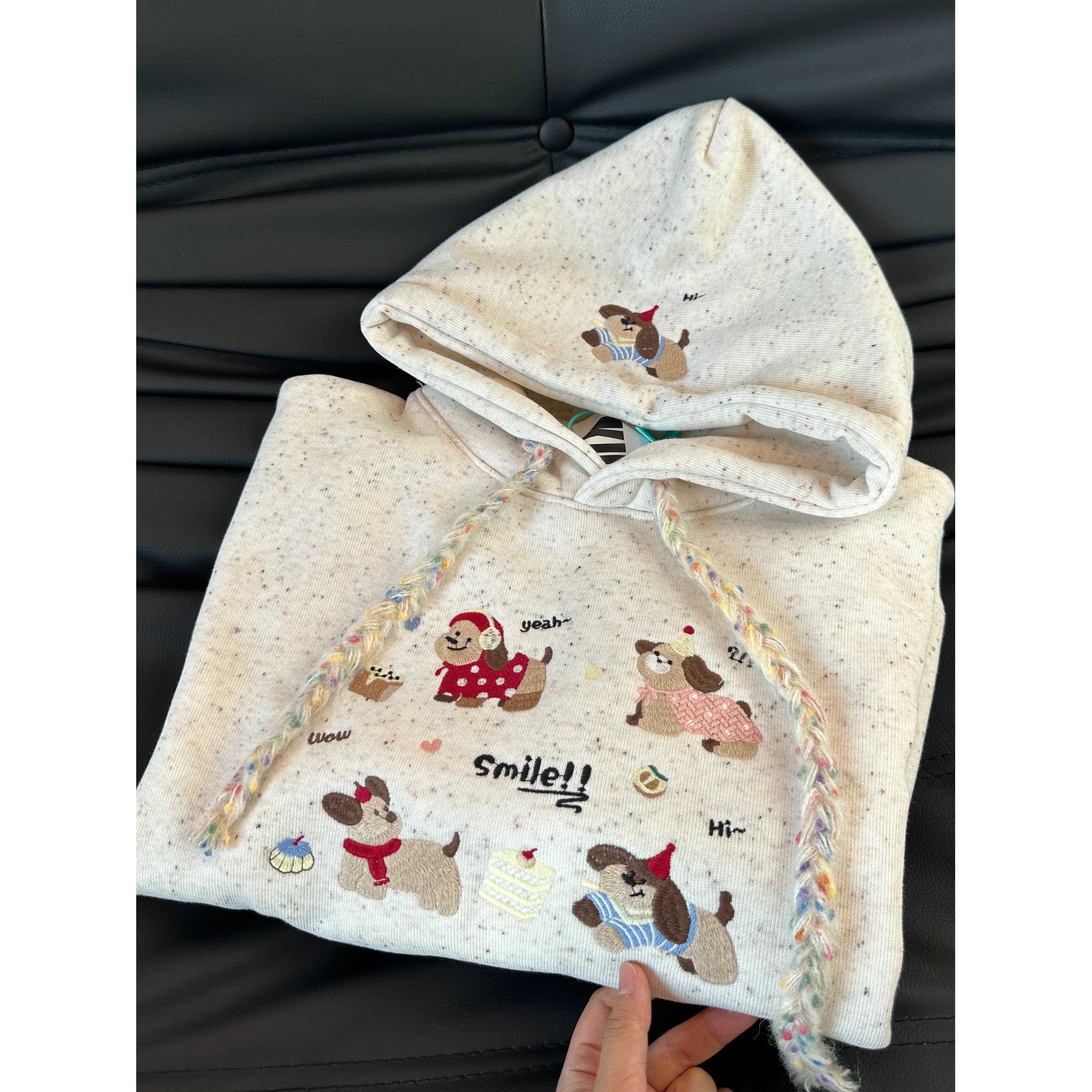 韩系冬季加绒重磅可爱彩点卡通重工刺绣连帽卫衣女减龄慵懒风卫衣