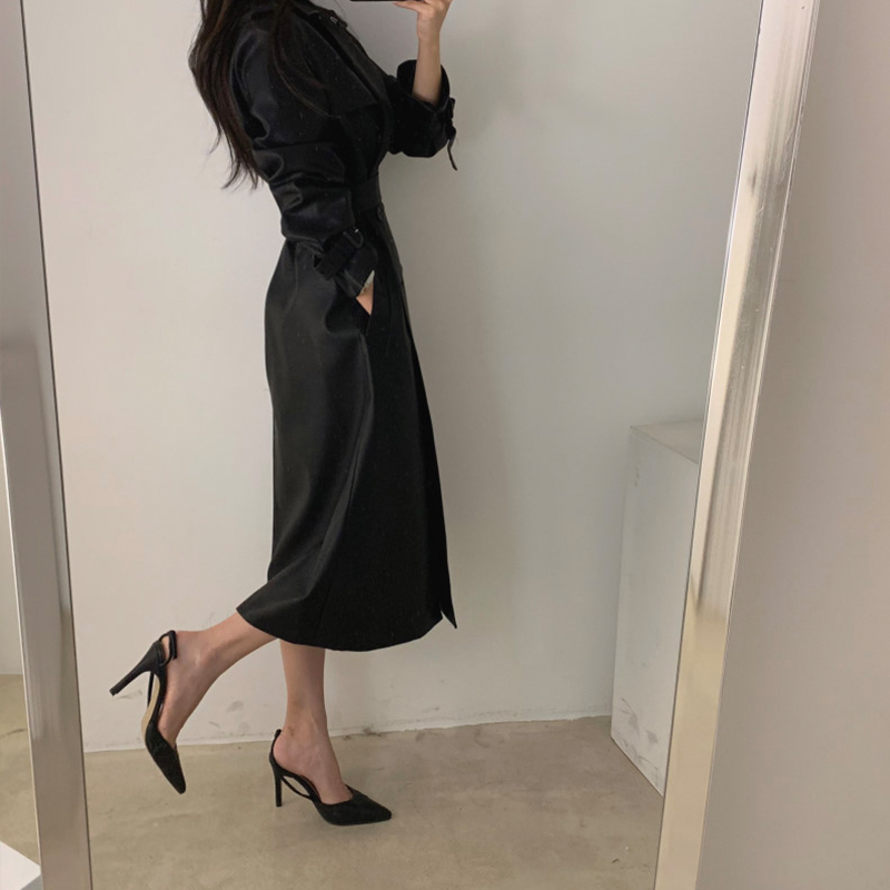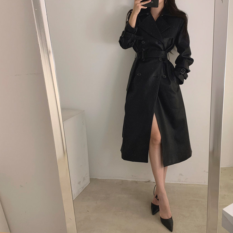 三小姐的咖啡黑色中长款过膝皮衣风衣2026新款女秋冬修身外套大衣