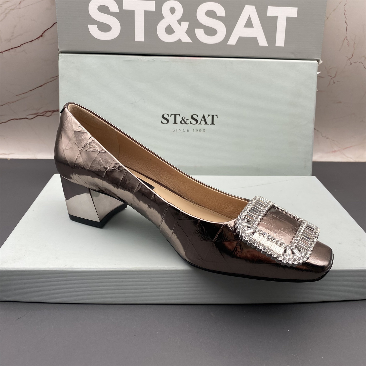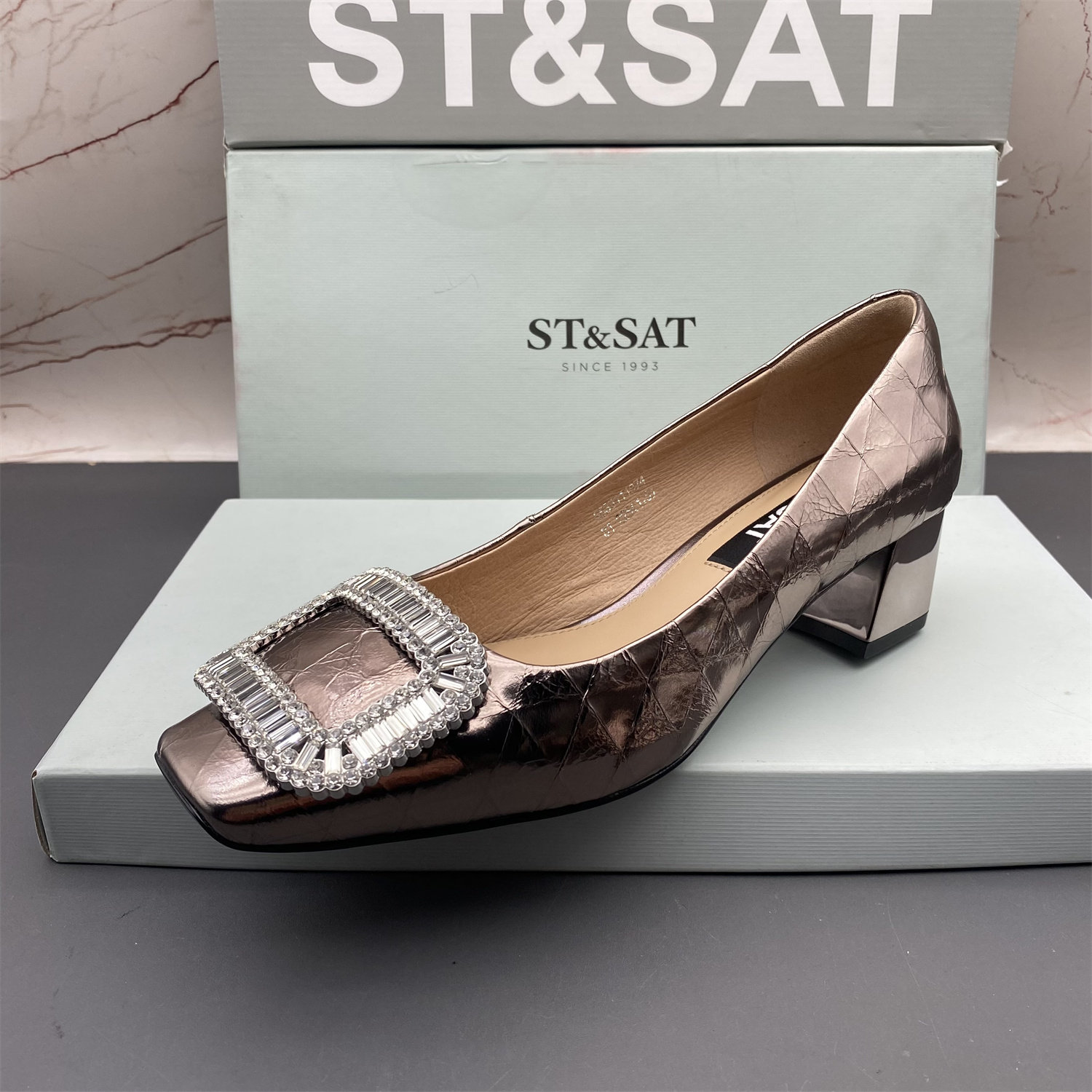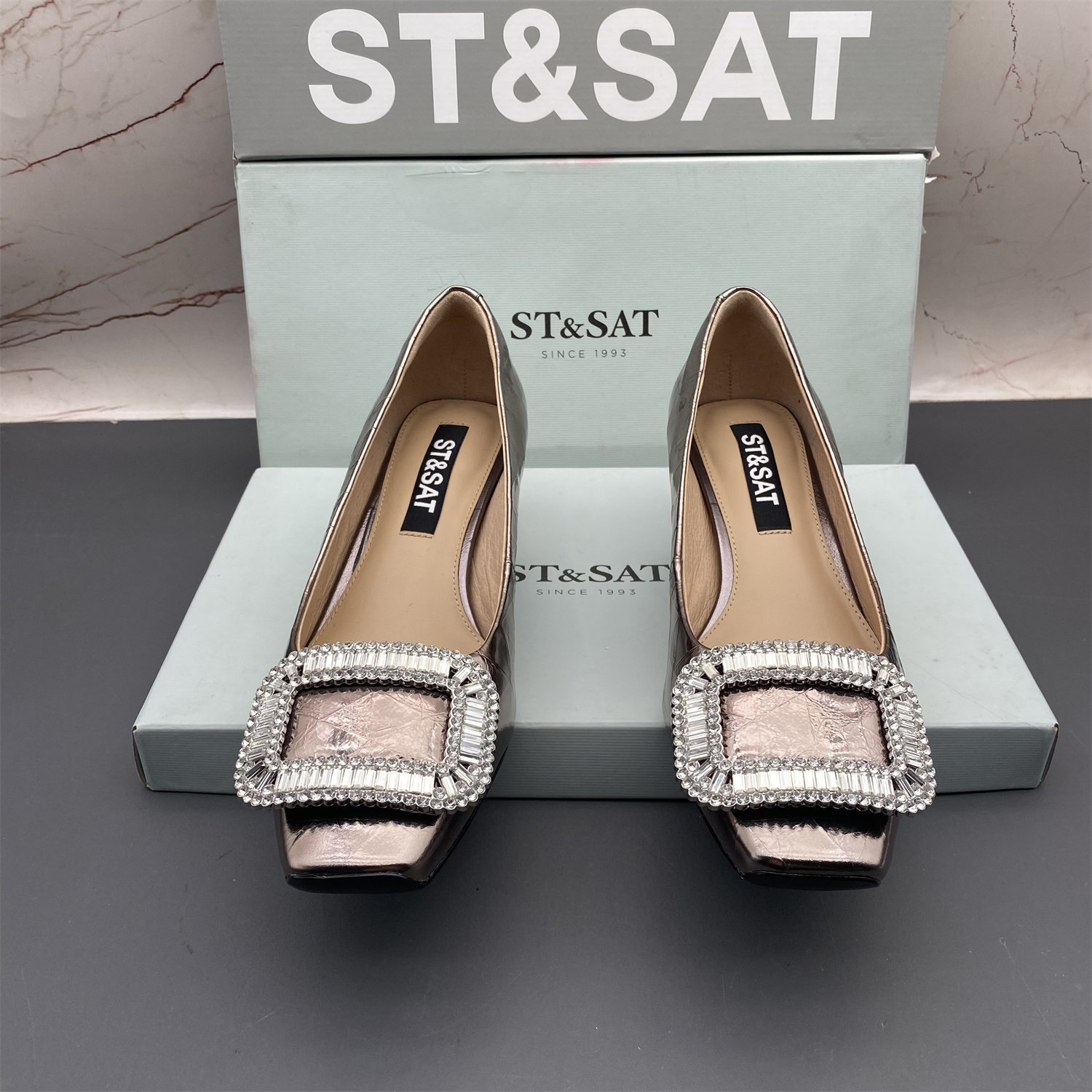 正品ST&SAT星期六撤柜断码牛皮女鞋粗跟中跟浅口水钻方头时尚单鞋