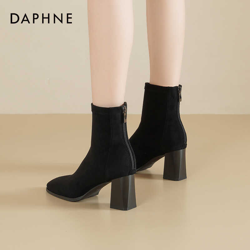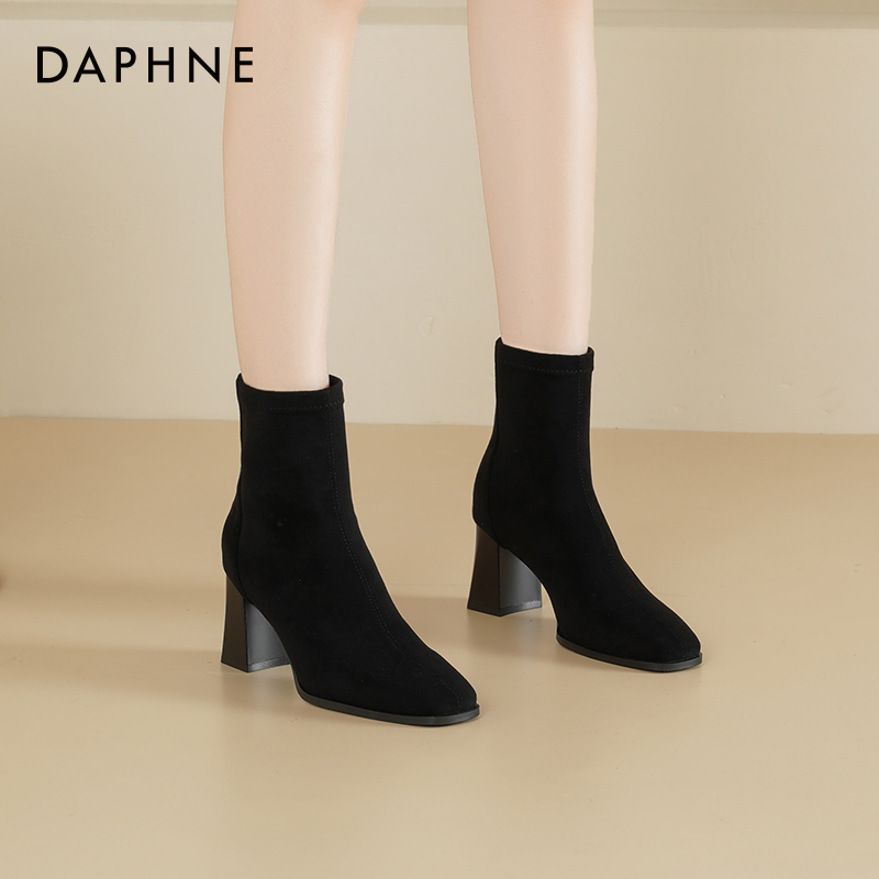 达芙妮黑色高跟短靴女2025新款冬季法式高跟鞋粗跟绒面瘦瘦靴子女