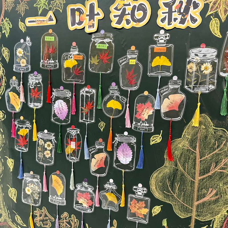 一叶知秋班级文化墙创意黑板报幼儿园拾秋天手工书签DIY材料环创布置装饰透明瓶子贴纸树叶子植物标本塑封膜
