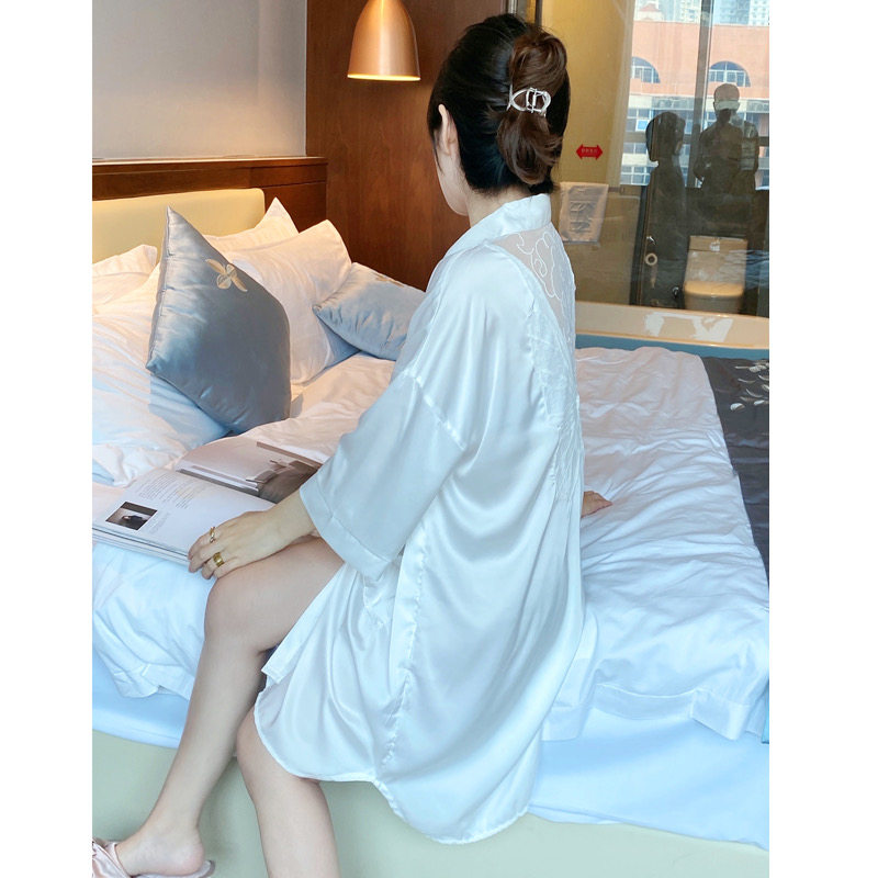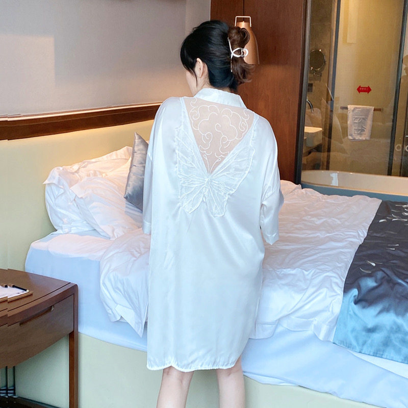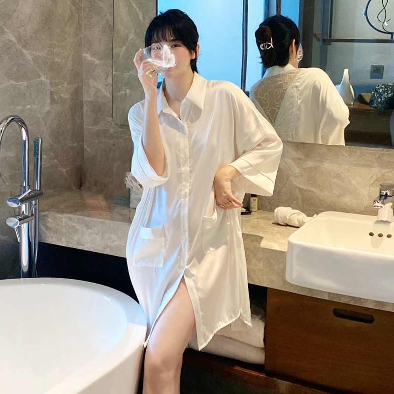 冰丝绸睡衣女夏薄款男友风衬衫长款睡裙大码纯白色春秋季诱惑睡袍