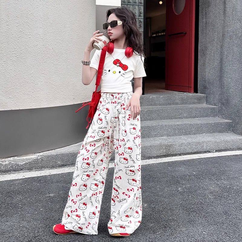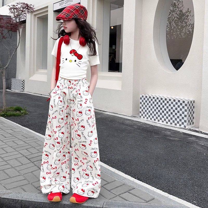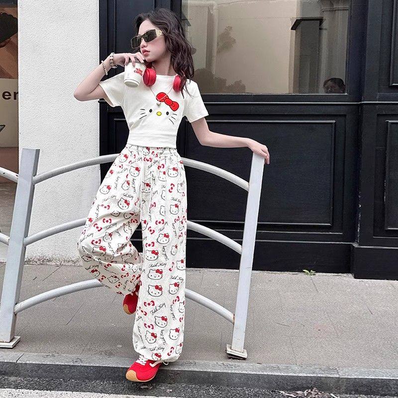 女童套装夏季2025新款时尚气质中大童卡通印花短袖长裤两件套童装
