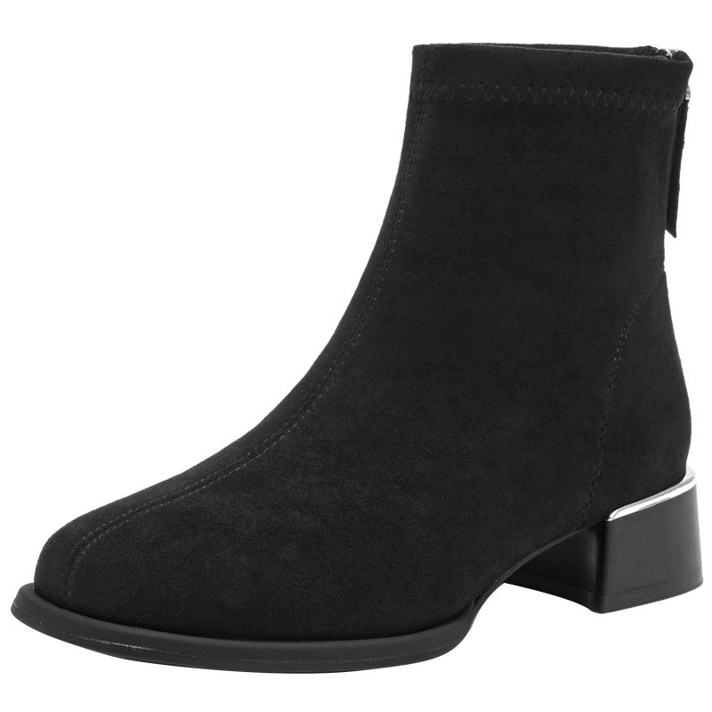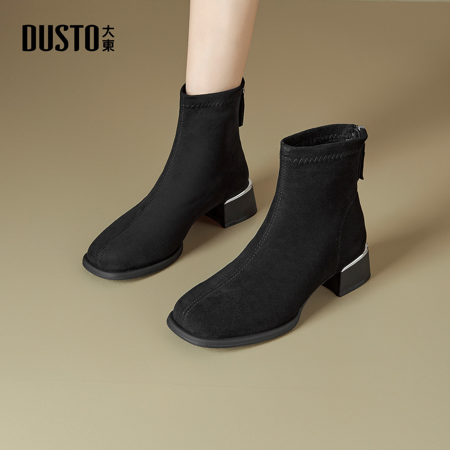 大东官方粗跟短靴女2025新款冬季加绒黑色小裸靴高跟靴女士瘦瘦靴