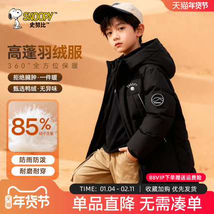 史努比童装男童冬季羽绒服中大童中长款连帽外套黑色衣服儿童上衣