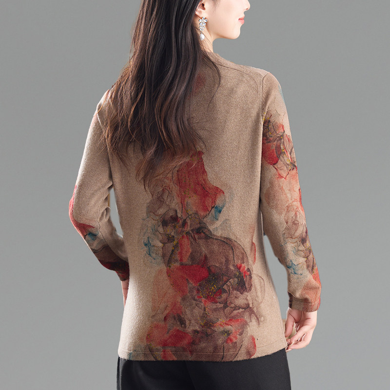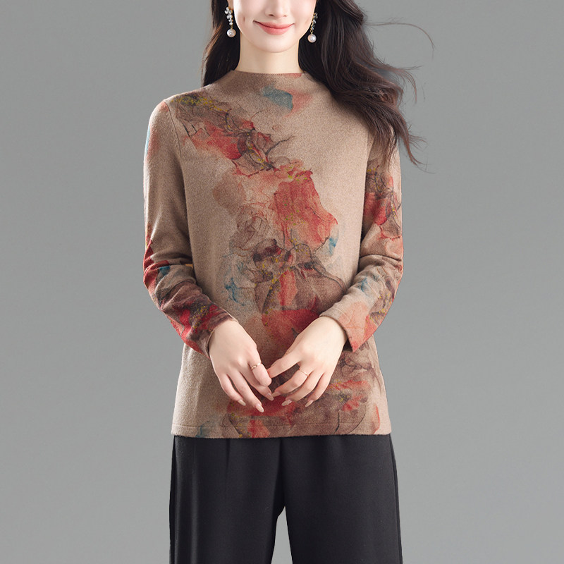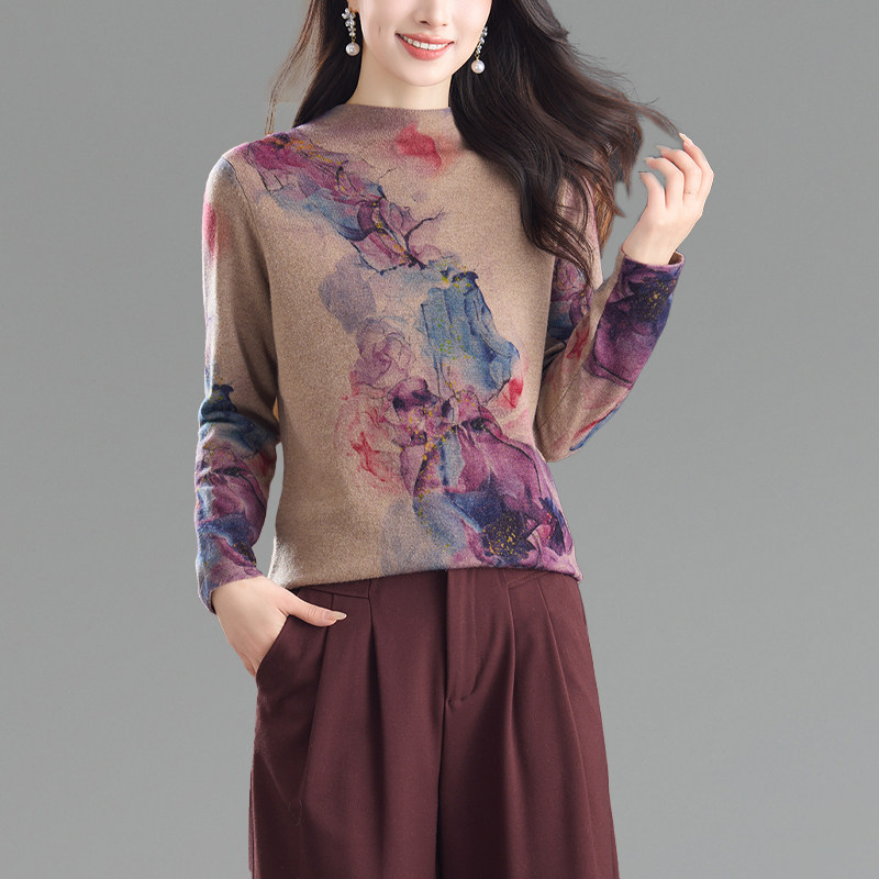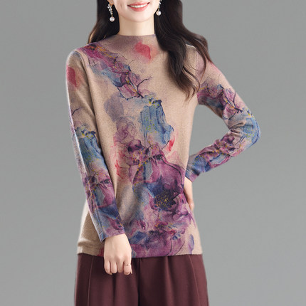 鄂尔多斯市精纺加厚100%纯羊绒衫半高领印花毛衣女宽松针织打底衫