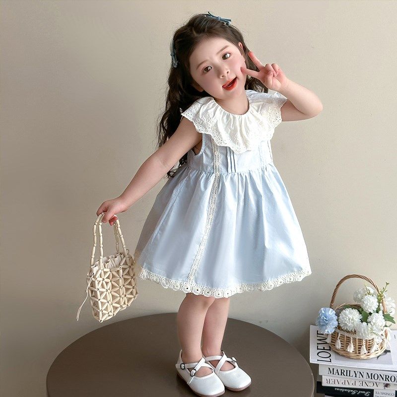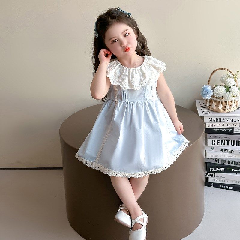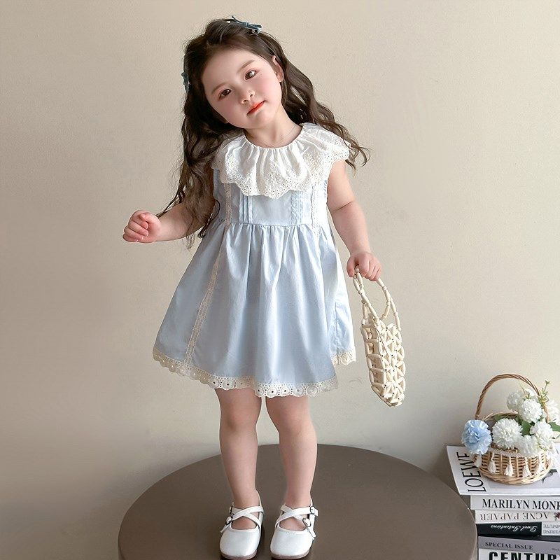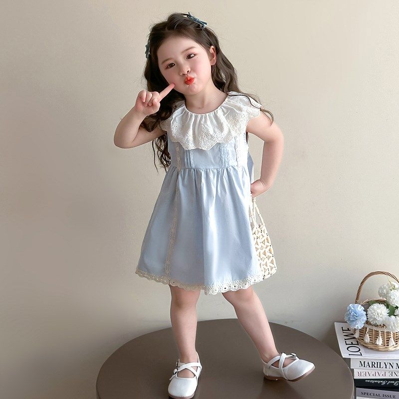 女童连衣裙2025夏季儿童夏装女宝宝蓝色背心裙蕾丝领夏天公主裙子