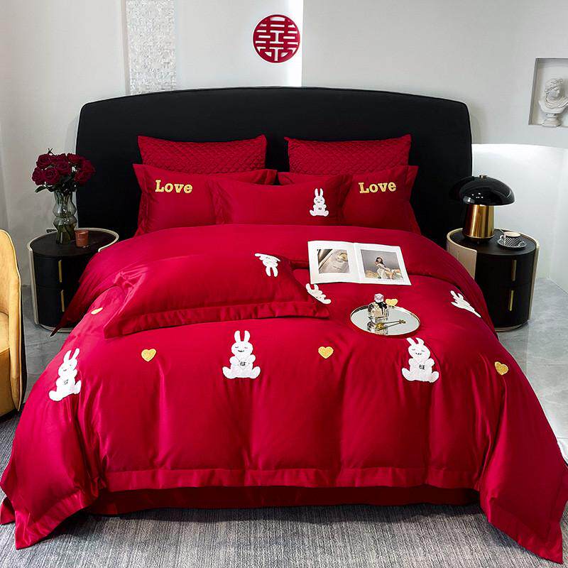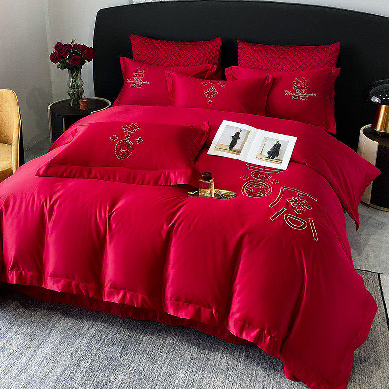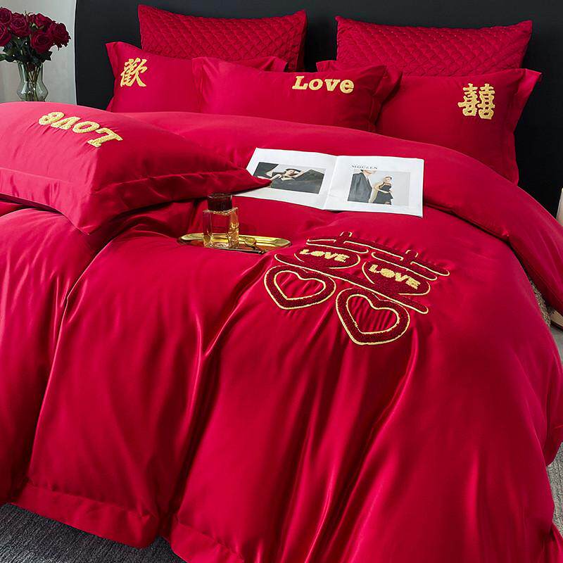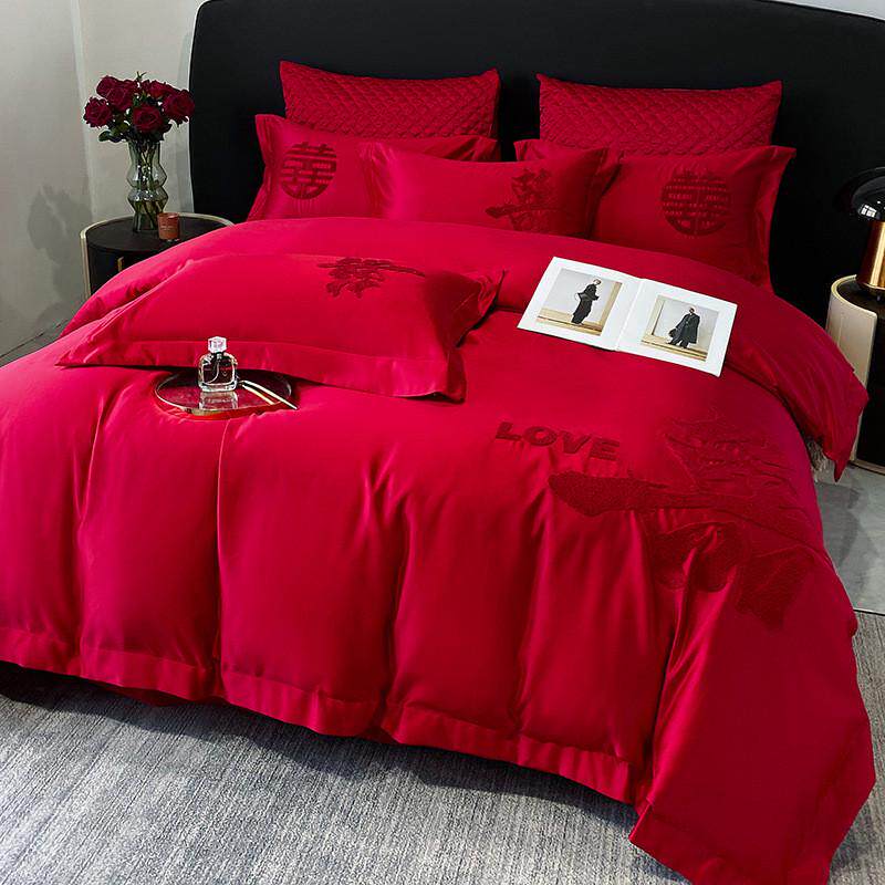 厂家批发婚庆刺绣四件套床上用品床单被套床笠结婚红色喜庆款套件