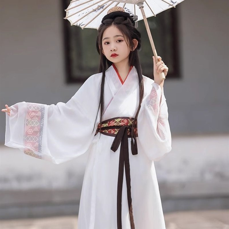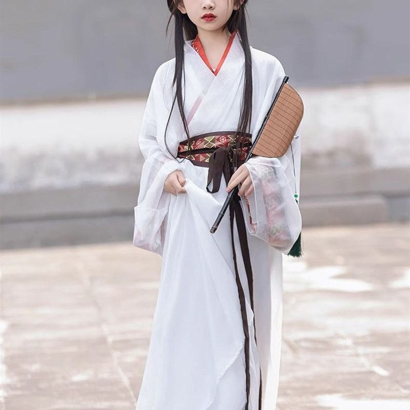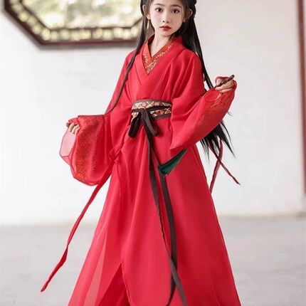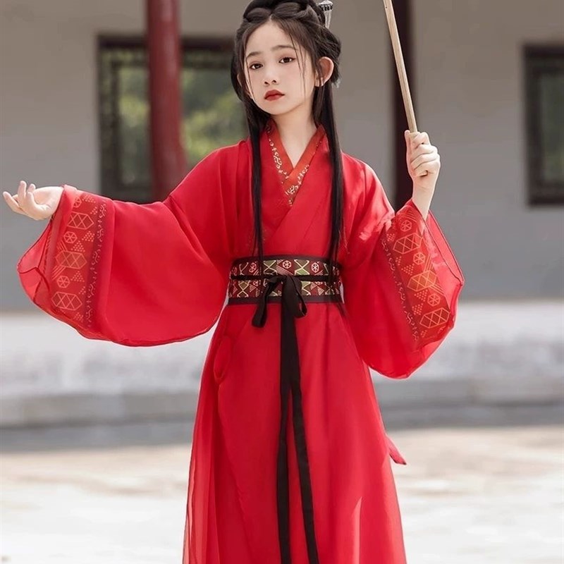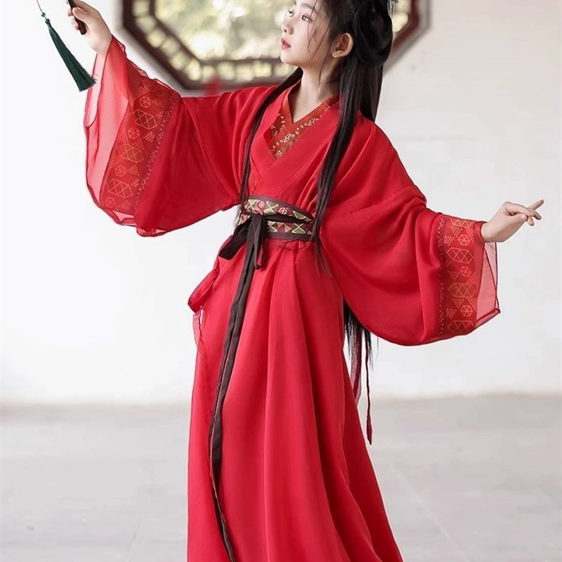 高端红色战国袍女童汉服直裾传统交领复原款古装儿童中国风大袖衫