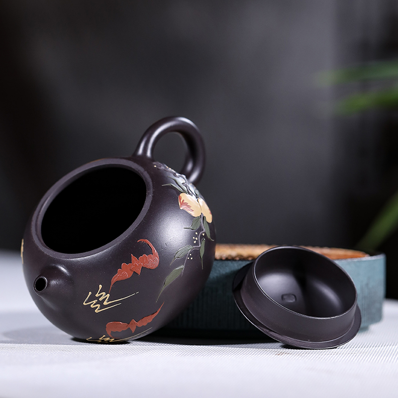 宜兴紫砂壶原矿黑朱泥西施壶仙桃套装名家手工泥绘200毫升球孔