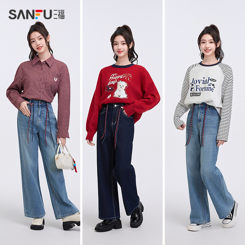 三福牛仔长裤2025秋季撞色裤绳宽松阔腿裤时尚裤子女装496223