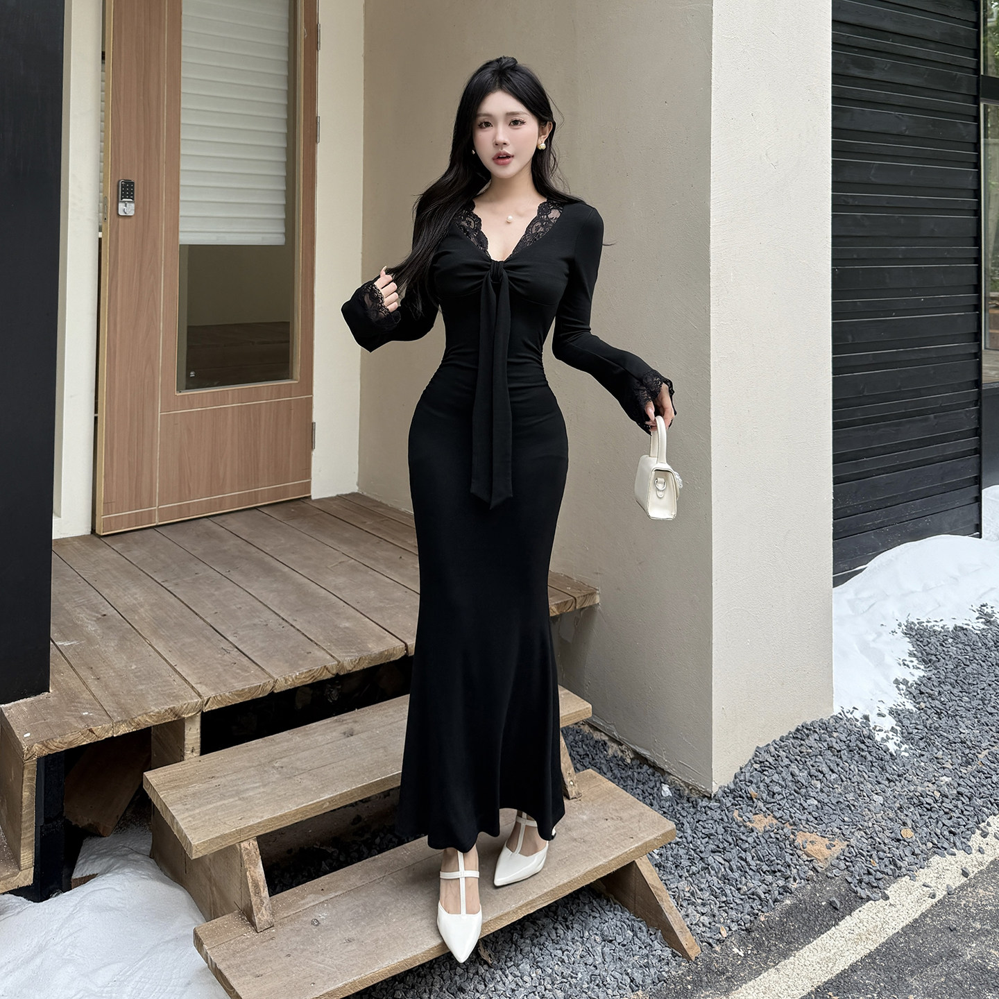 instahot 性感V领蕾丝黑色连衣裙女2025秋季新款轻奢宴会长袖长裙