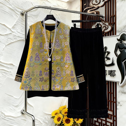 新中式国风特大码女装2026春季新款高级感百搭马甲丝绒胖mm三件套