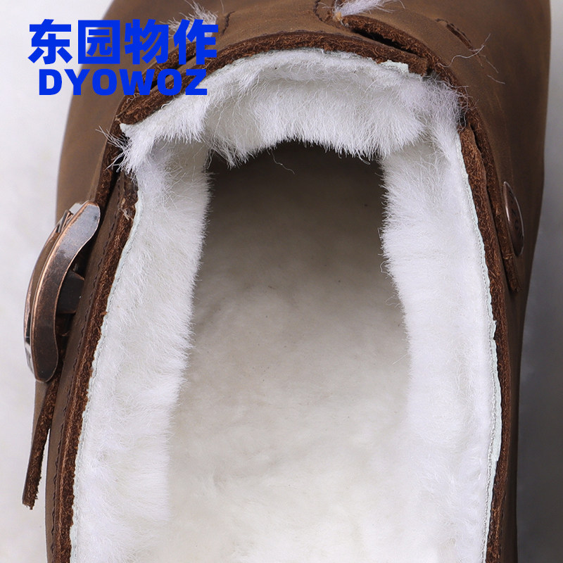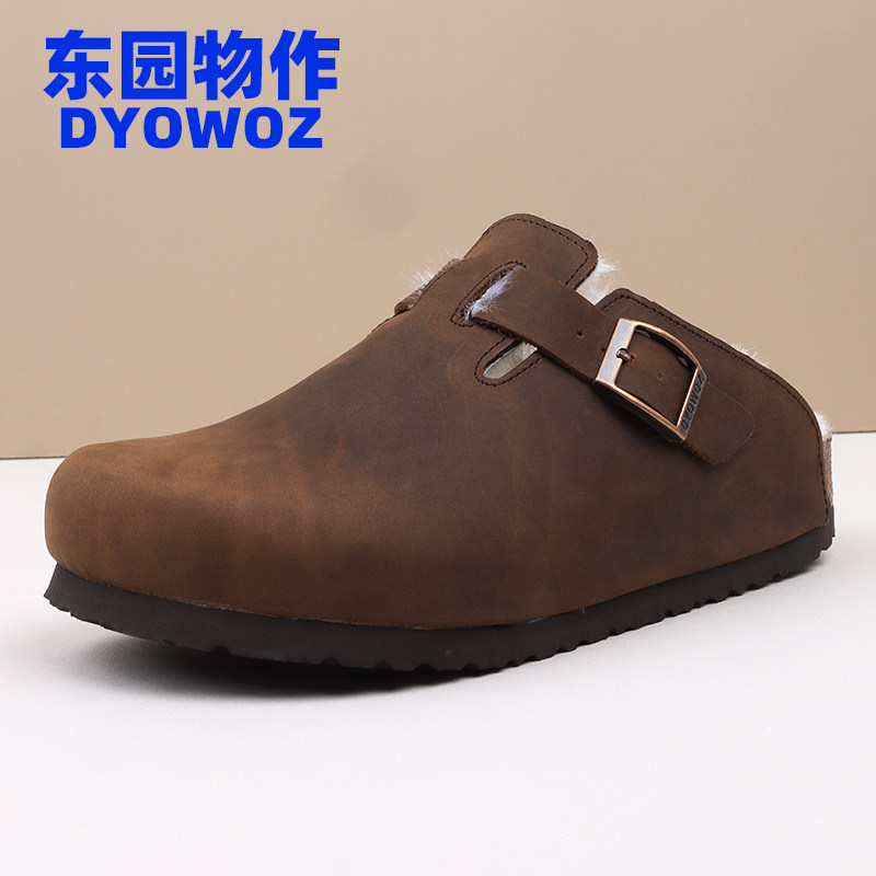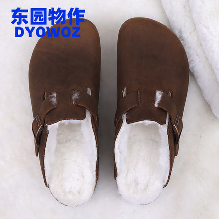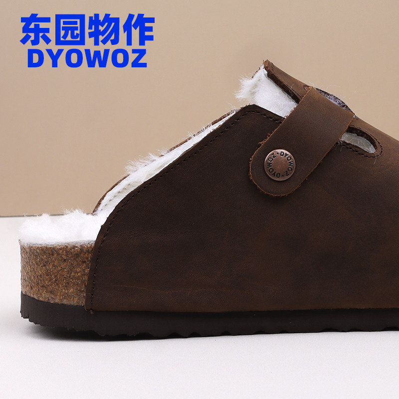 DYOWOZ/东园物作真皮加毛勃肯软木拖鞋女半包头日系百搭防滑外穿