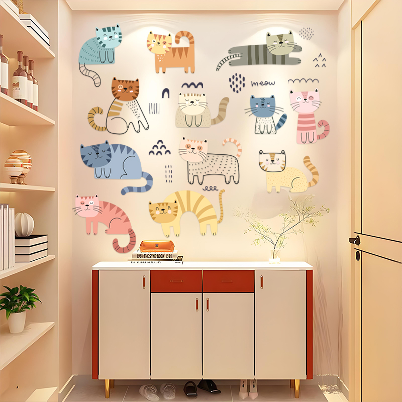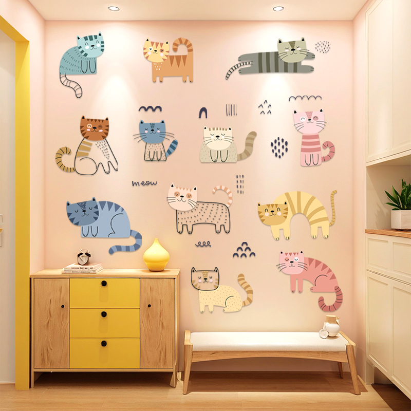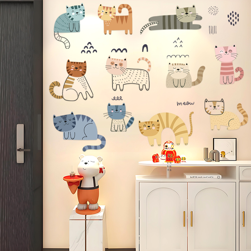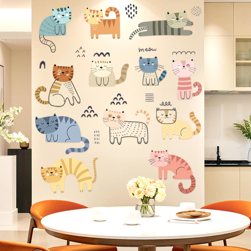 简约小清新可移除墙贴纸防水自粘卡通可爱手绘猫咪墙壁装饰儿童房