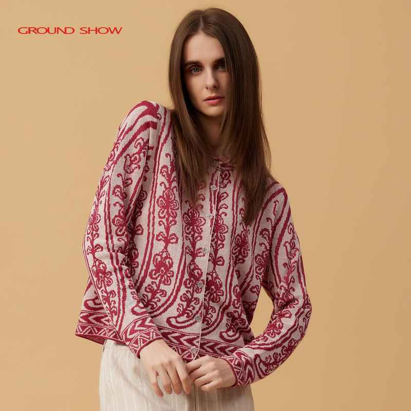 阁兰秀2025年春季新品长袖双色提花亚麻针织小开衫短外套复古女装