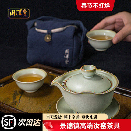 汝窑旅行茶具套装户外便携式泡茶杯汝瓷手抓盖碗景德镇陶瓷礼盒装