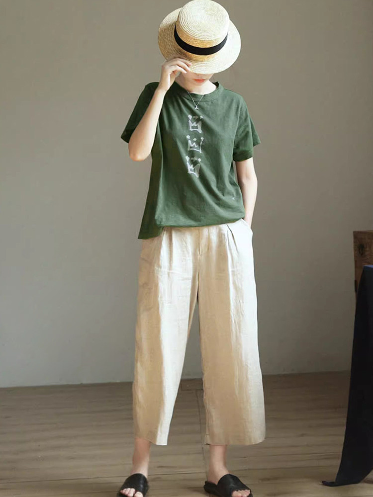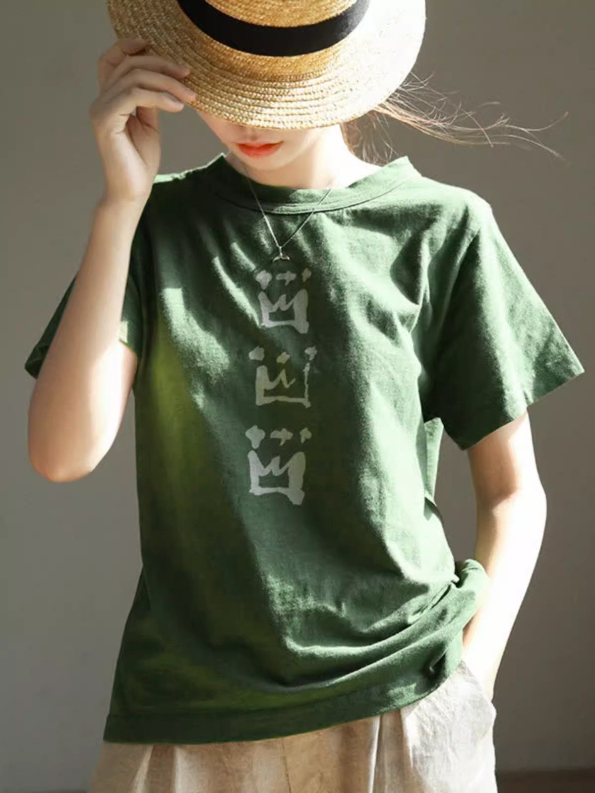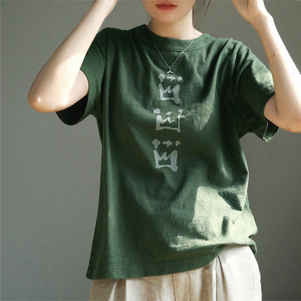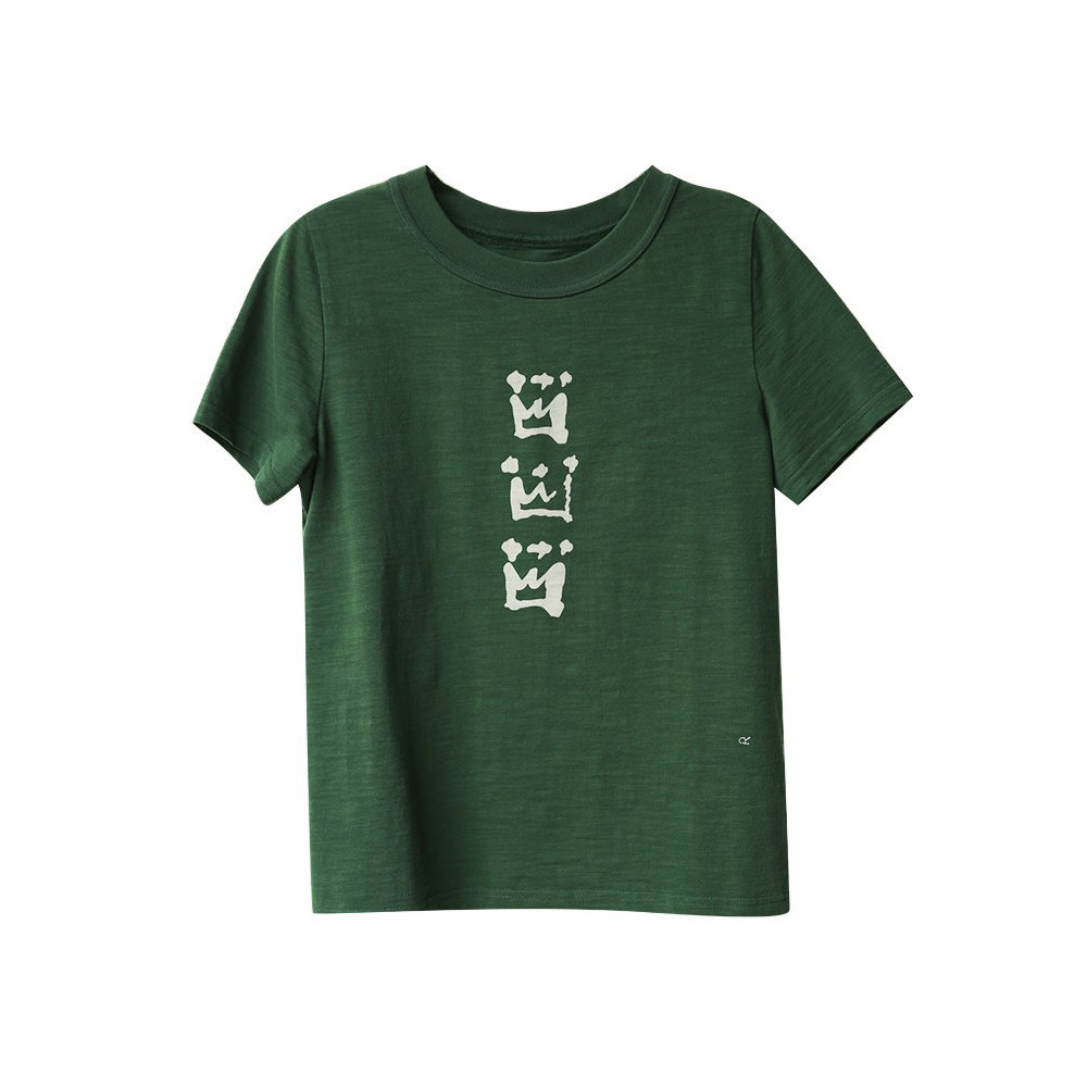 谷家 舒适透气竹节棉印花上衣 文艺百搭全棉短袖T恤女春夏季新款