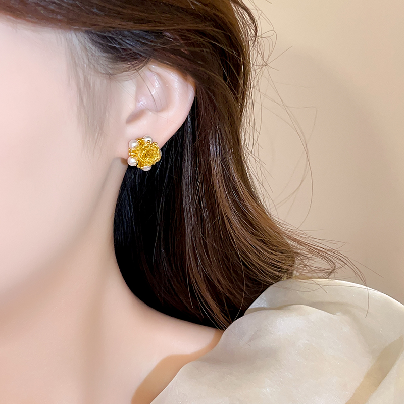 黄色网纱玫瑰珍珠耳钉独特漂亮