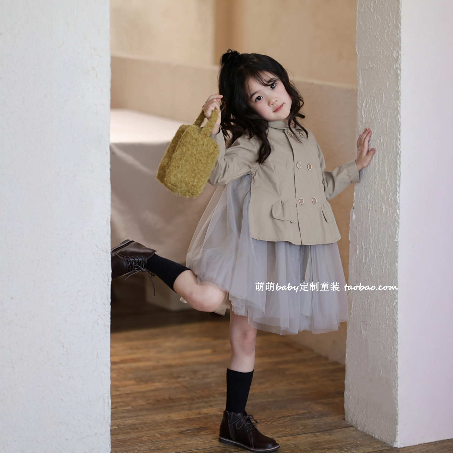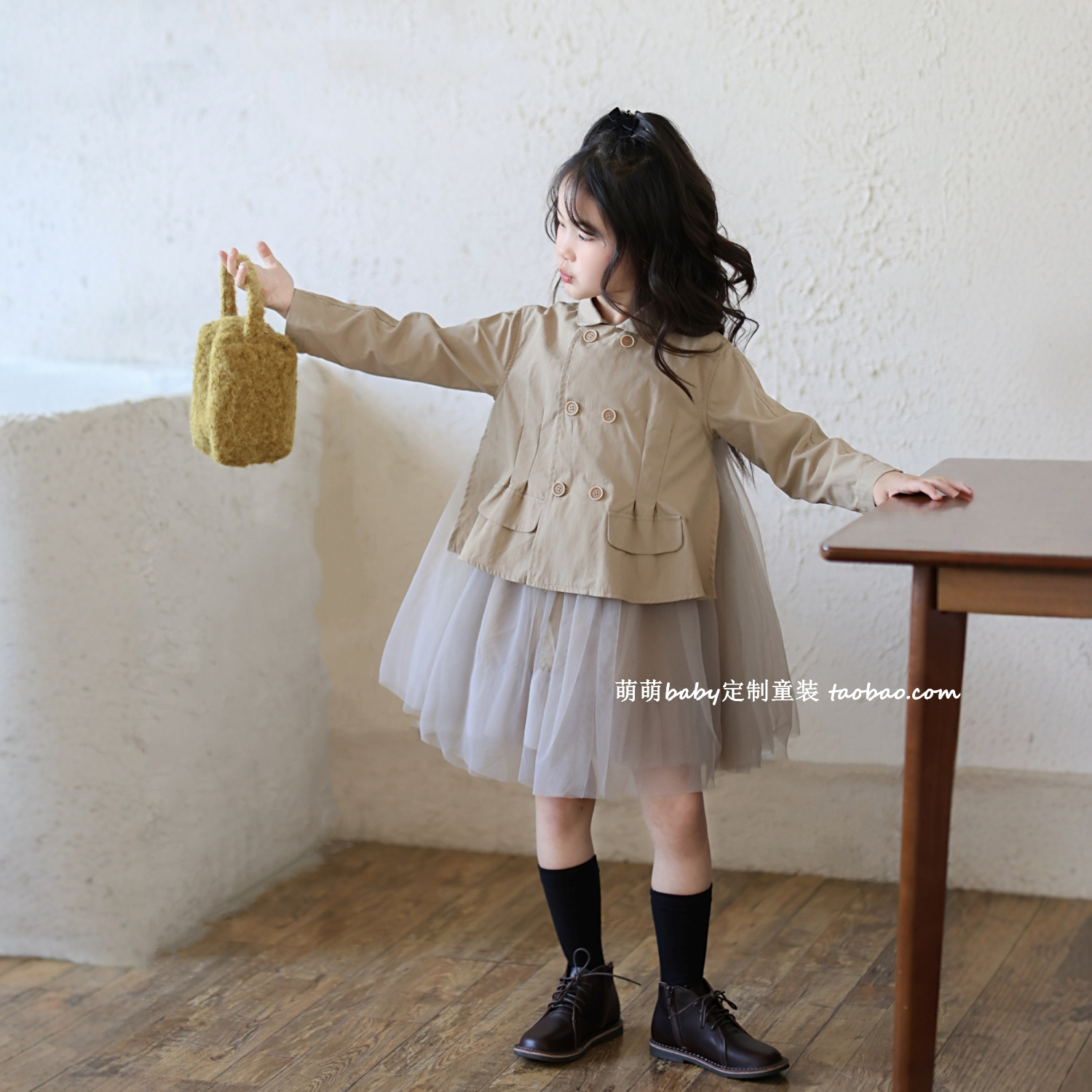 女童双排扣风衣外套2025秋季新款小女孩气质娃娃衫风衣网纱裙夹克