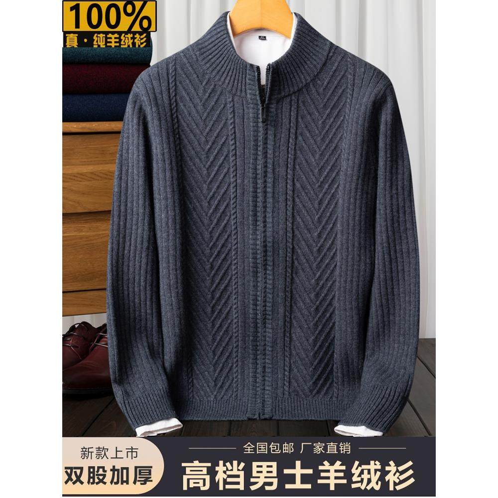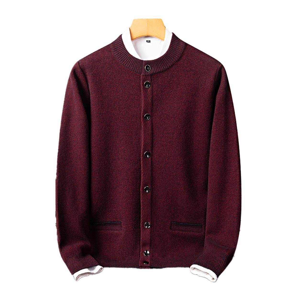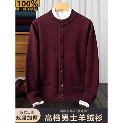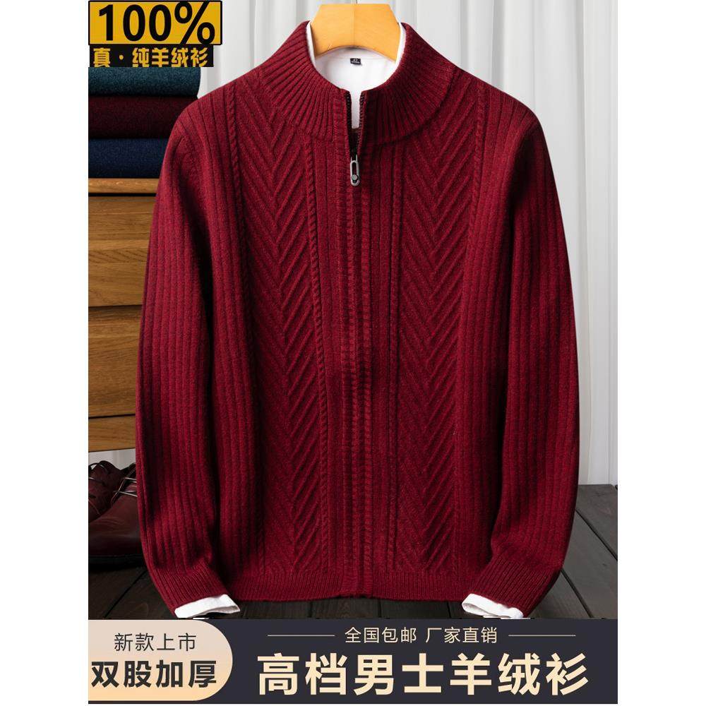 鄂尔多斯市100%纯羊绒衫男开衫本命年秋冬季中老年人爸爸红色毛衣