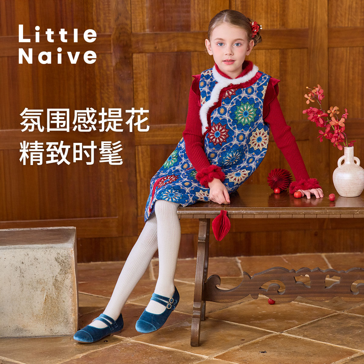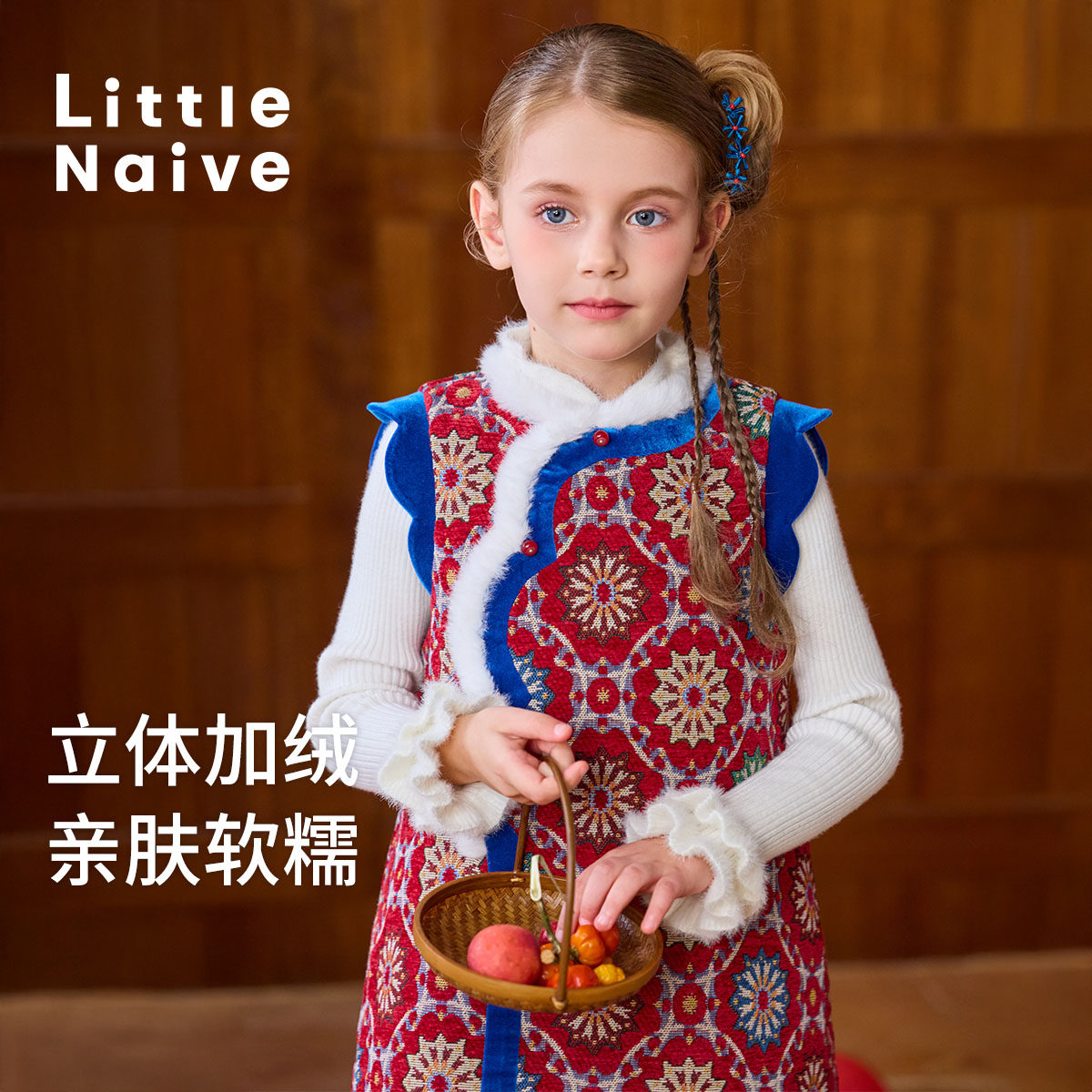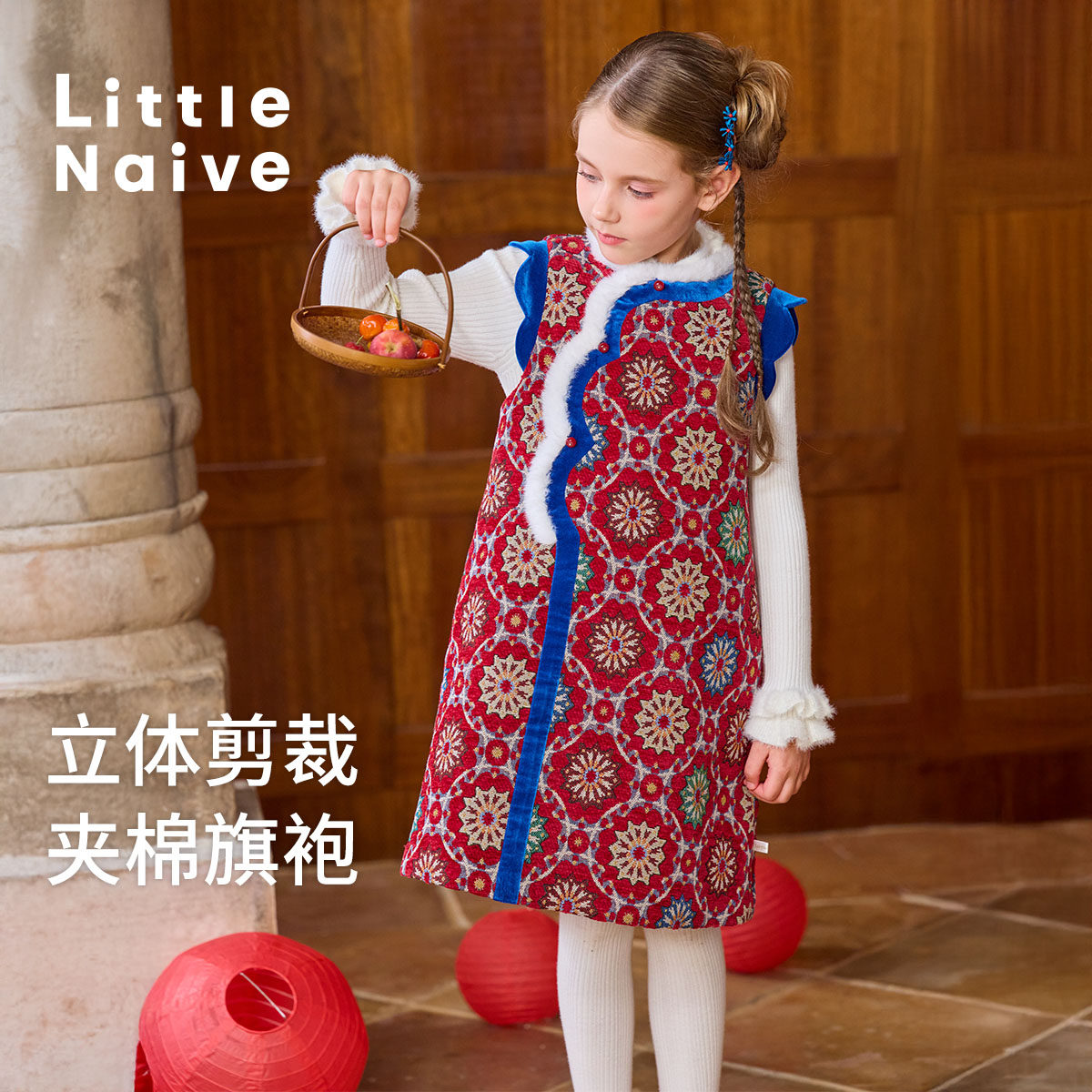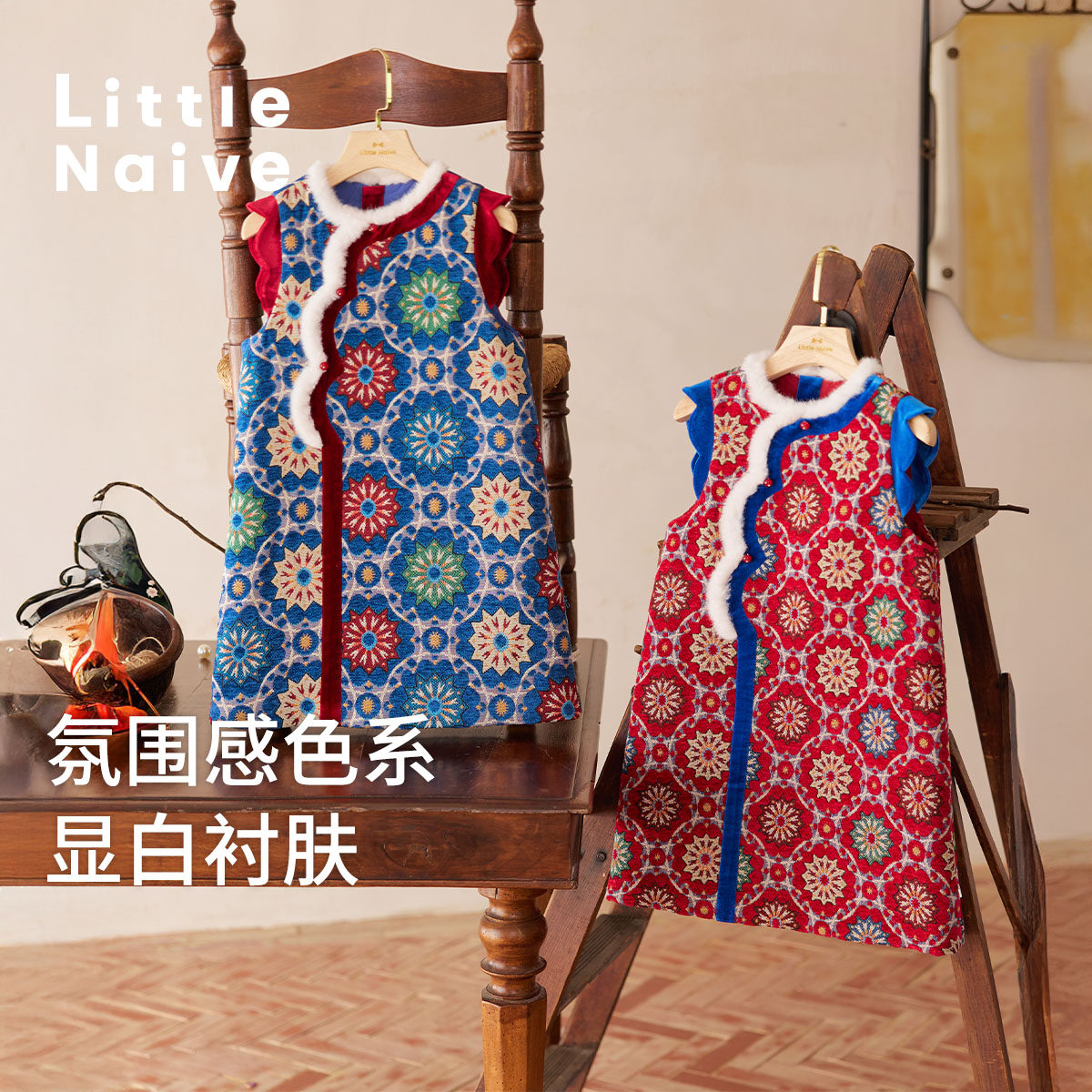 Little Naive女童夹棉连衣裙秋冬新中式提花旗袍背心裙儿童拜年服
