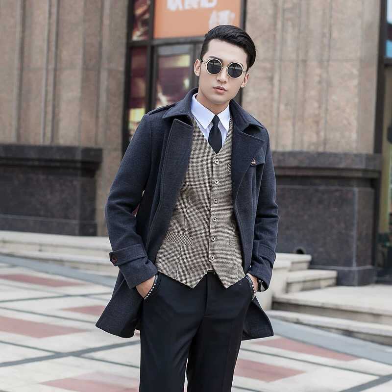 男士商务西装领中长款羊毛呢外套披风行政潮流休闲风衣驼色大衣男