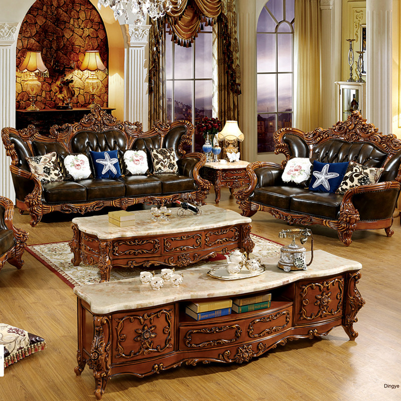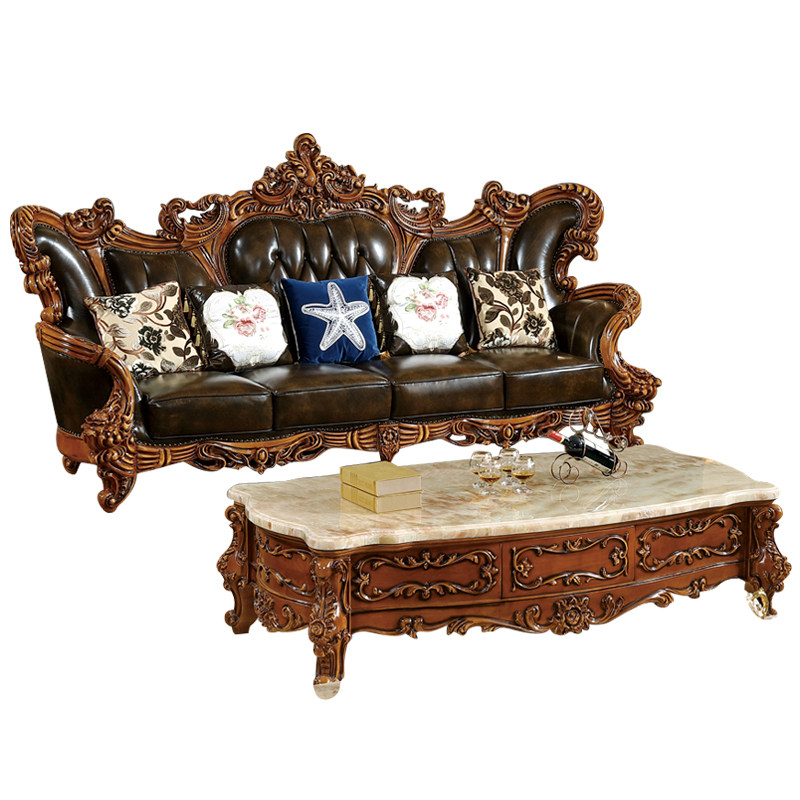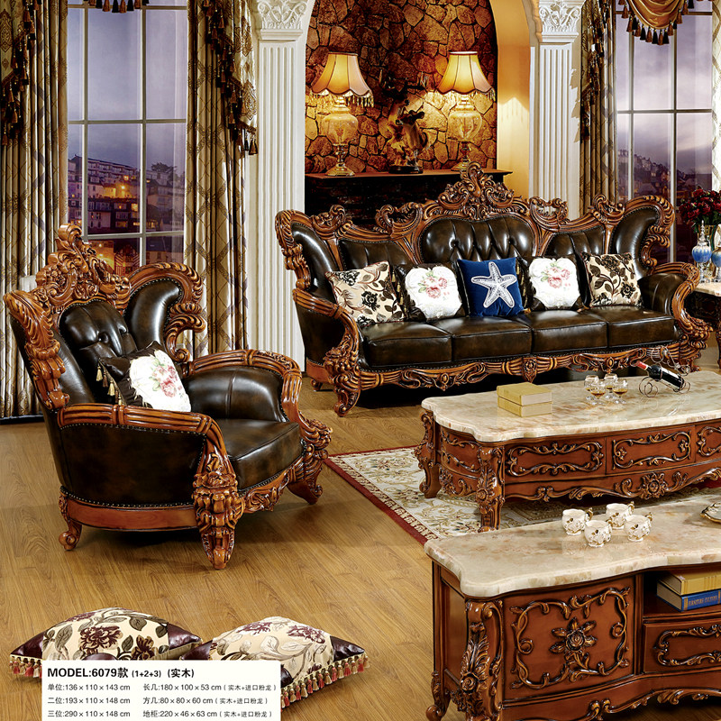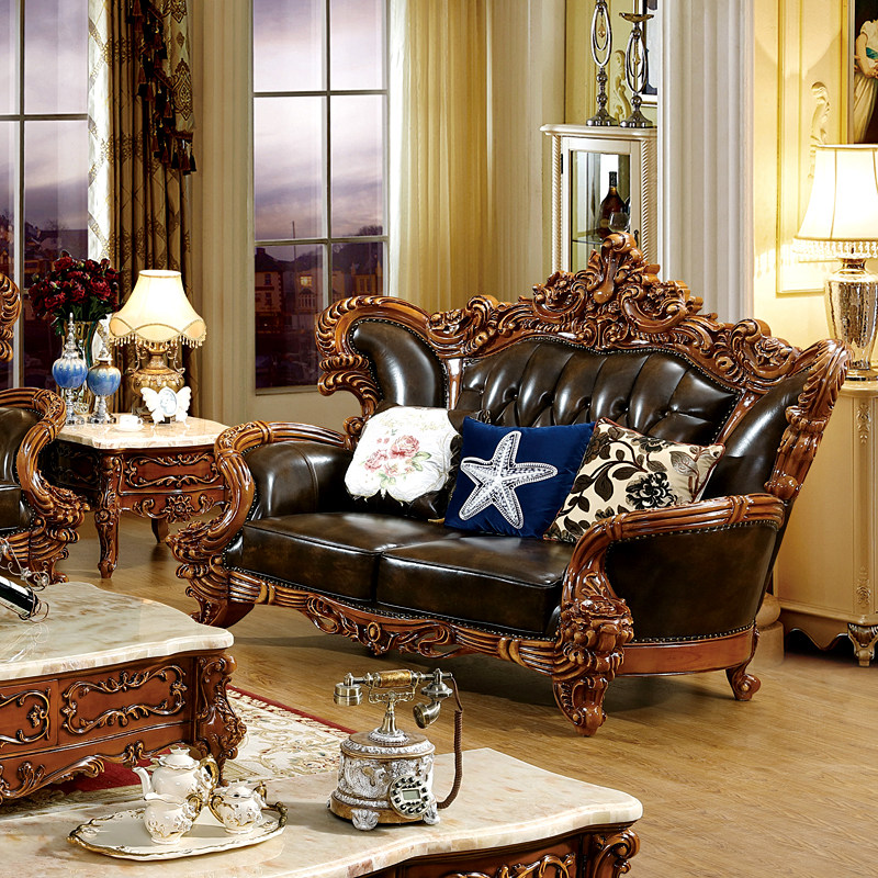 欧式风实木烤漆雕花奢华真皮沙发