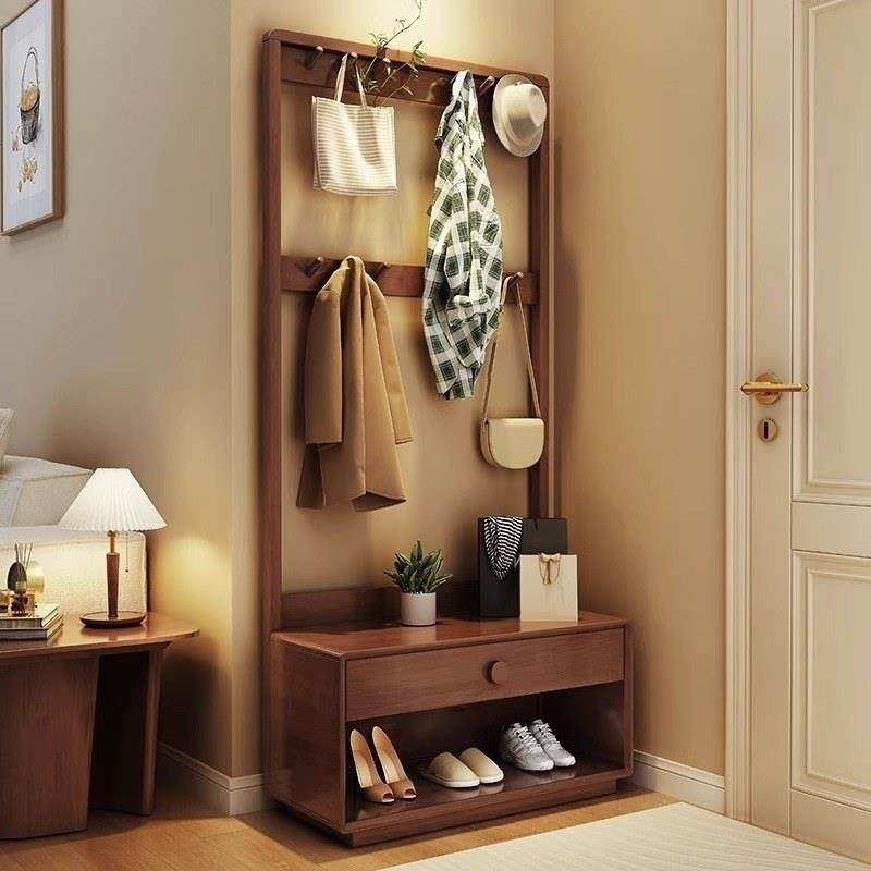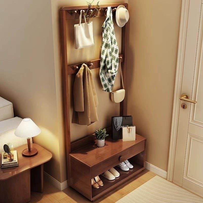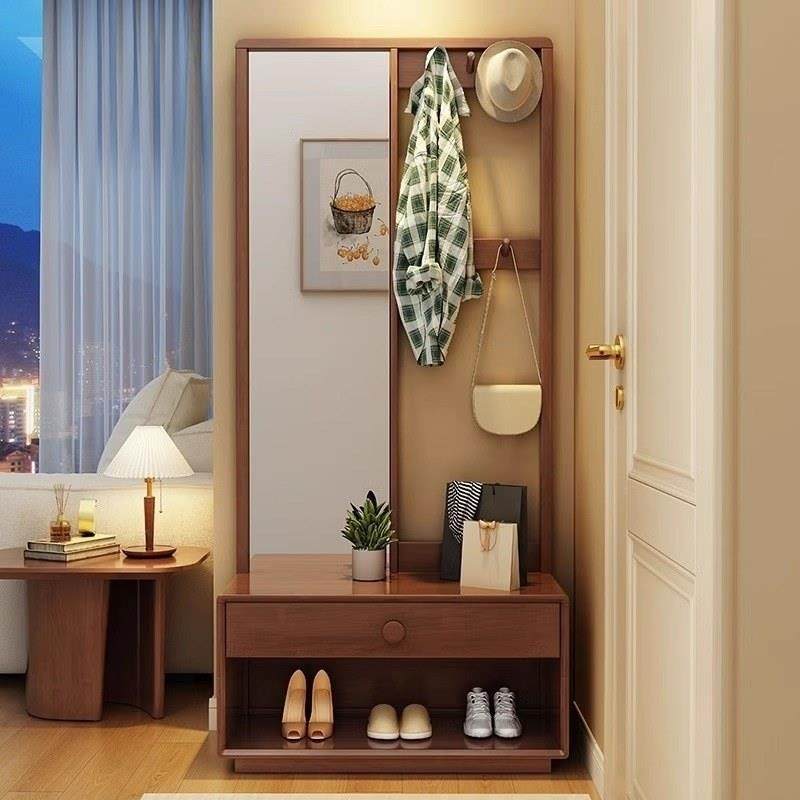 艾比森实木衣帽架落地卧室家用换鞋凳穿衣镜一体入户多功能挂衣架