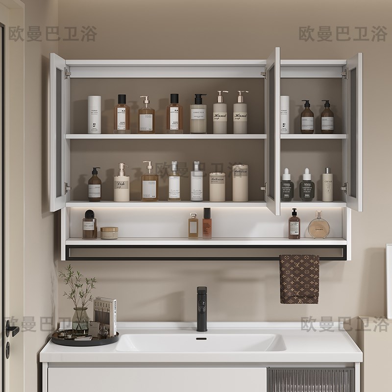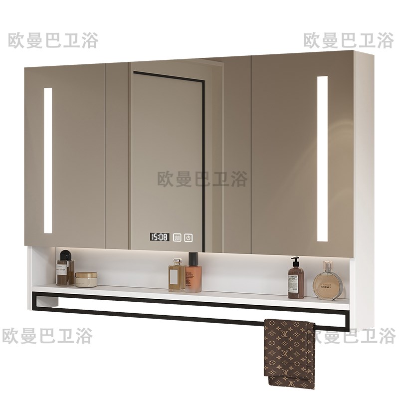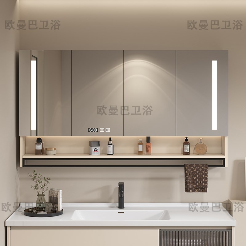 奶油色实木浴室镜柜智能卫生间毛巾杆挂墙式单独洗手间镜子置物架