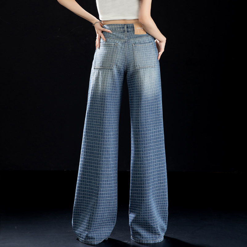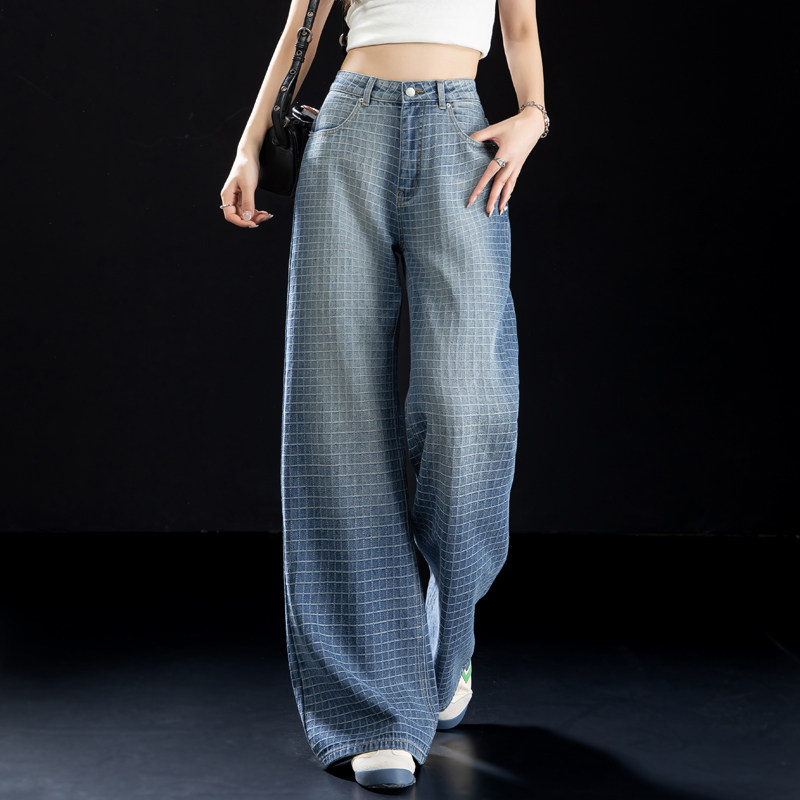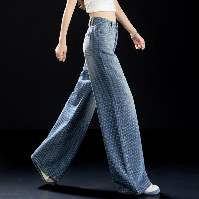 提花格子牛仔裤女高腰直筒阔腿裤