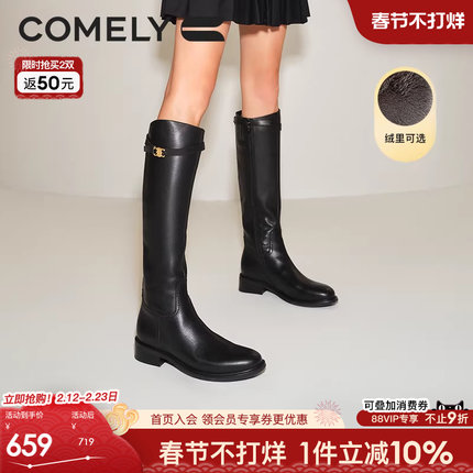 康莉王子璇同款真皮骑士靴女秋冬圆头粗跟牛皮加绒黑色长筒靴靴子